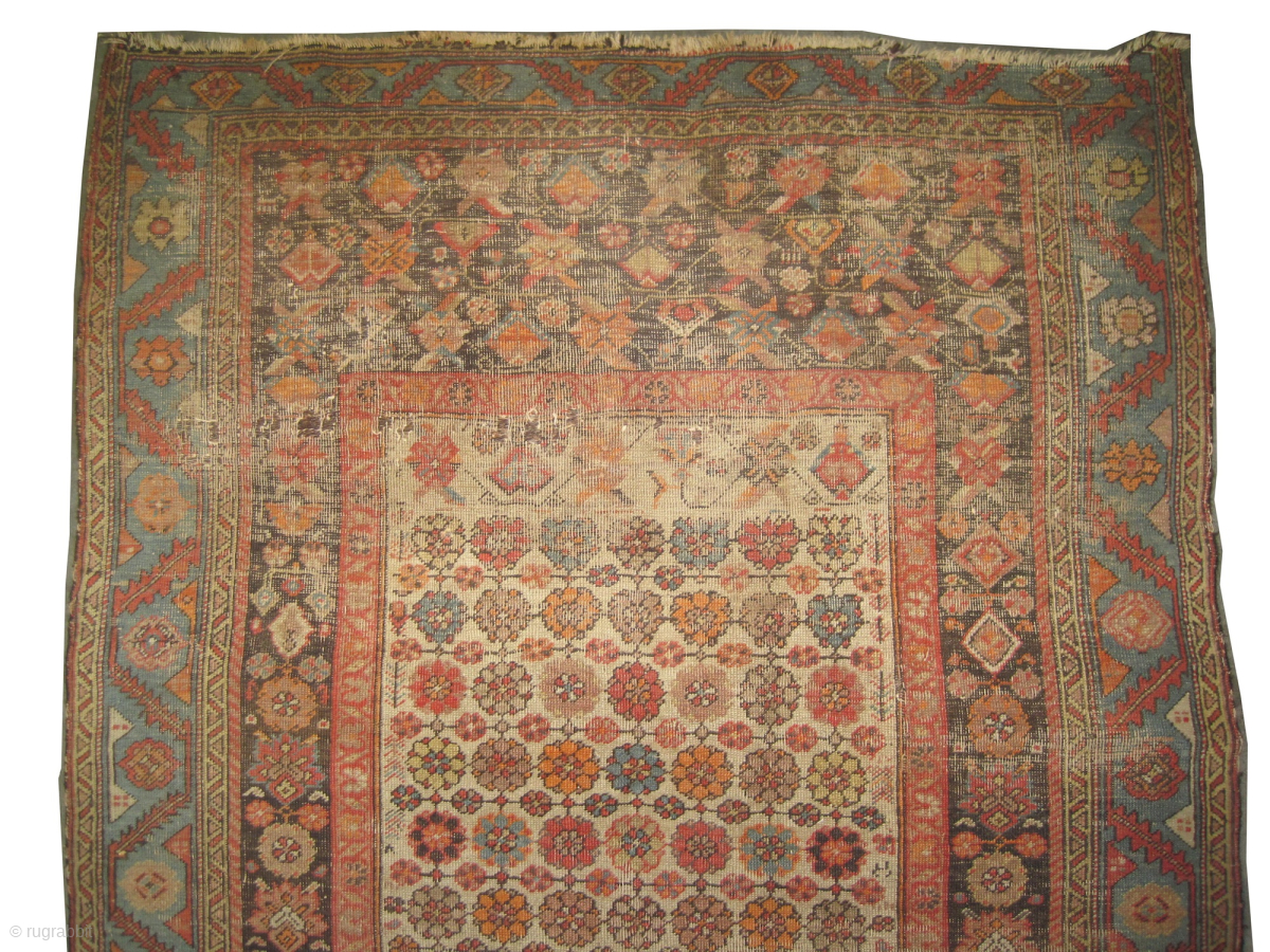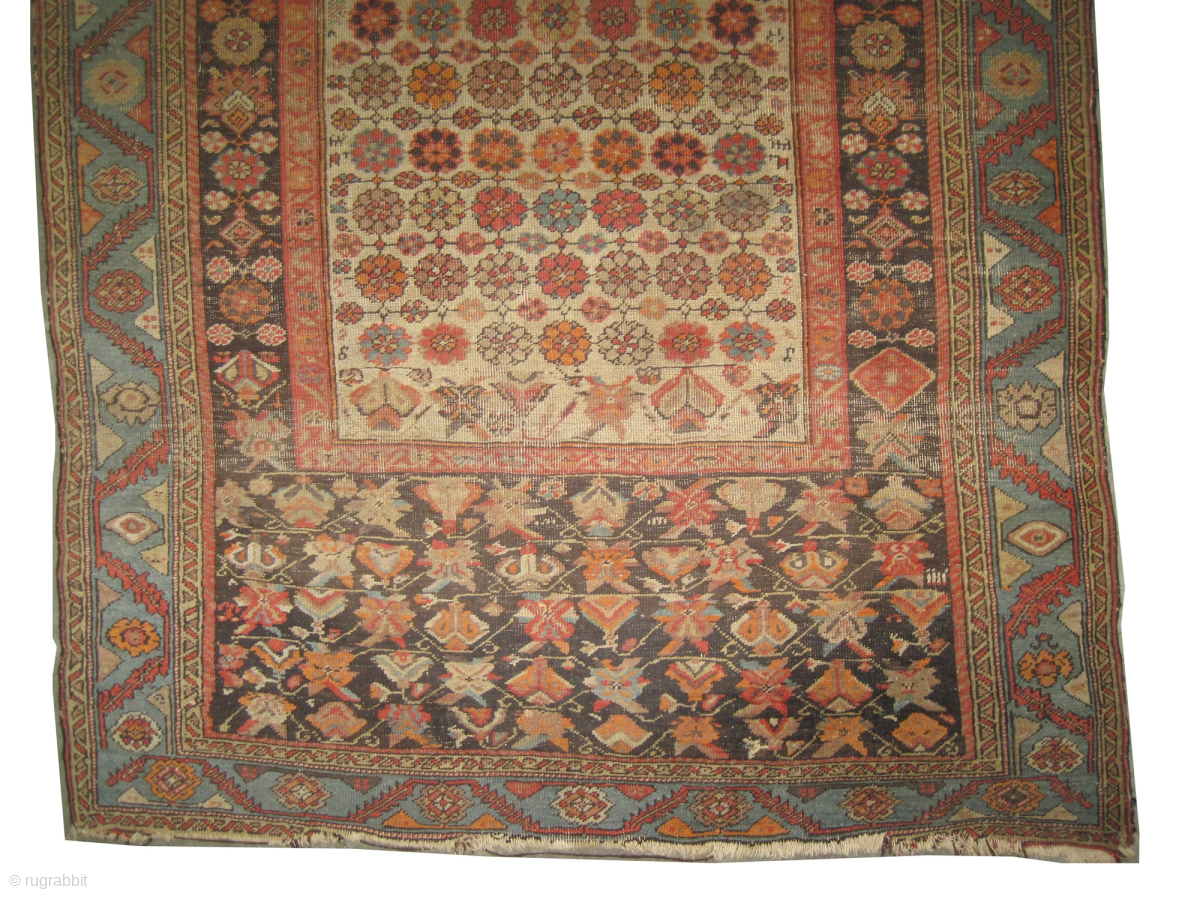 Rare example, vegetables dyes, the knots are hand spun wool, the black knots are oxidized, the center square is ivory with all over design, the background color is indigo, the surrounded large border is sky blue, the pile is uniformly short, up part the pile is slightly used, finely knotted, in its original shape.