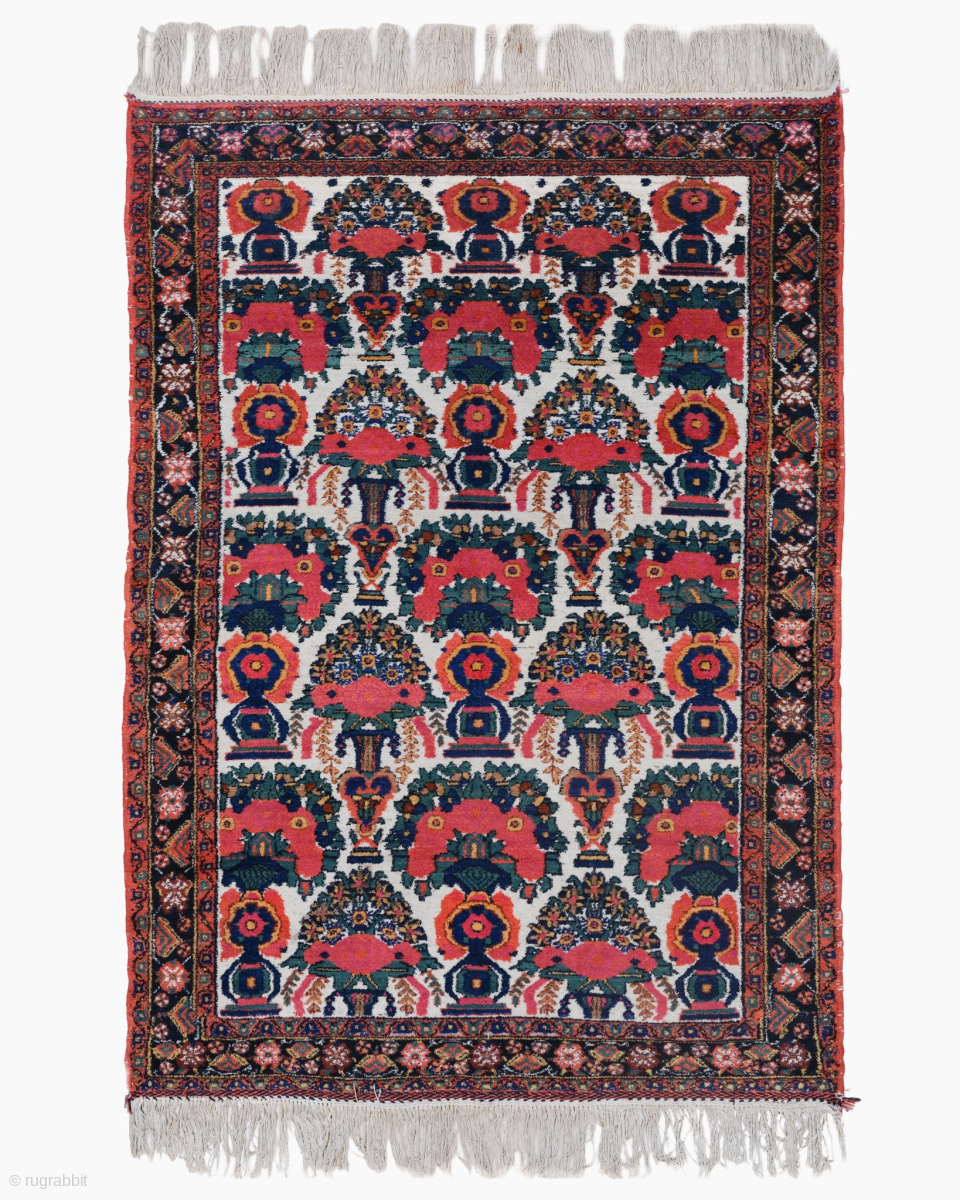 This rare late 19th century Persian Afshar rug highlights a powerful and rhythmic floral composition featuring a vertical arrangement of stylized “vase” or “flower pot” medallions anchored within a luminous ivory field. This structural balance between the repeating, large scale botanical motifs characterized by their tiered, fan like blooms and the expansive white ground reflects the pinnacle of the Afshar nomadic weaving tradition from South Central Persia. Rugs of this antiquity are world renowned for their graphic charm and their ability to blend formal Persian workshop aesthetics with the bold, expressive spirit of tribal craftsmanship.