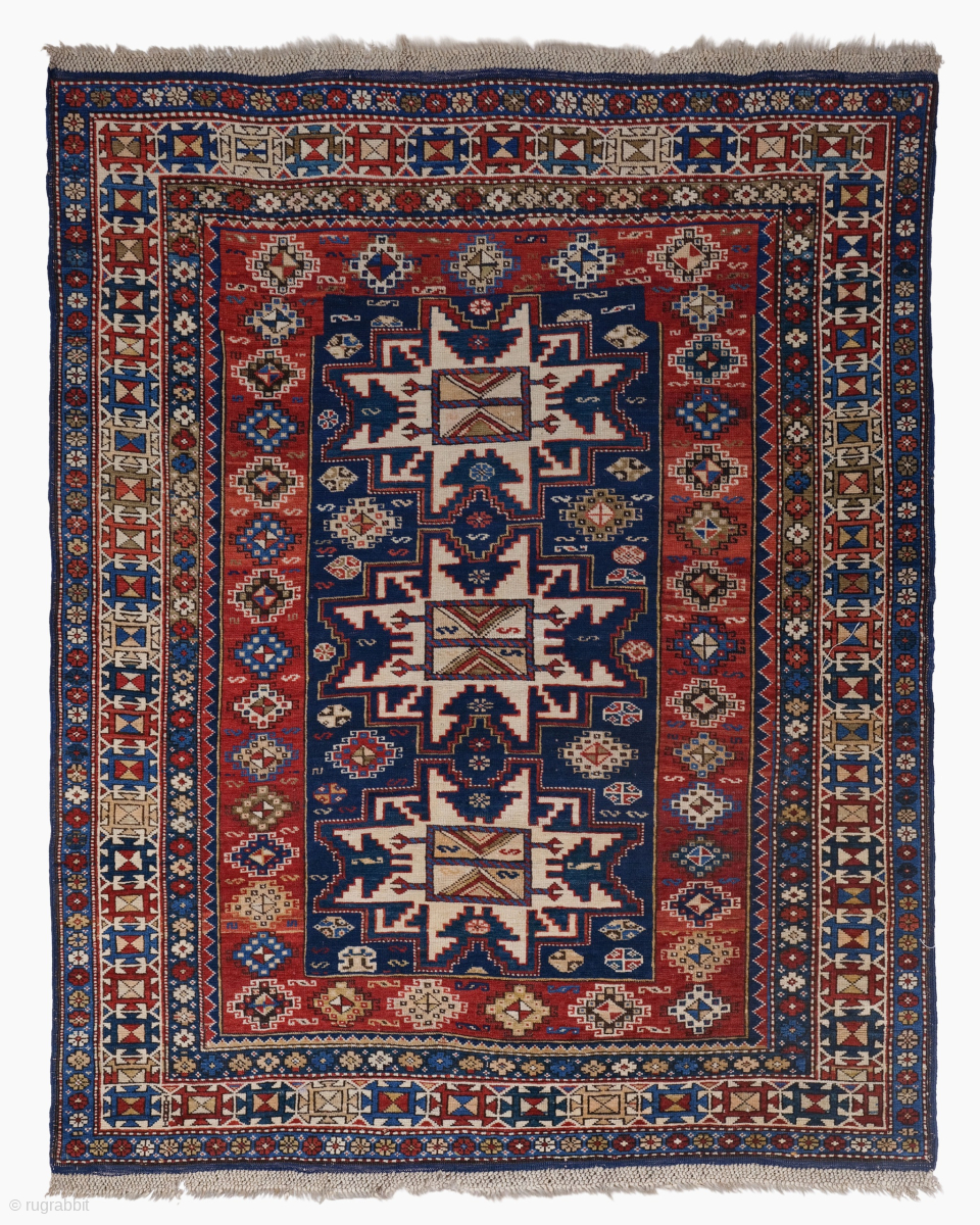 This rare late 19th century Caucasian Lezgi Shirvan rug highlights a powerful and rhythmic geometric composition featuring a vertical sequence of three monumental, nested “Lesghi” star medallions anchored within a rich, saturated midnight indigo field. This structural balance between the dark, expansive ground and the high contrast ivory and madder red medallions reflects the pinnacle of the East Caucasian weaving tradition, specifically merging the architectural strength of Lezgi motifs with the technical precision of Shirvan workshop productions. Rugs of this antiquity are world renowned for their complex iconography, where the eight pointed star serves as a central protective symbol of ancient tribal identity.