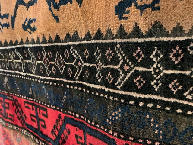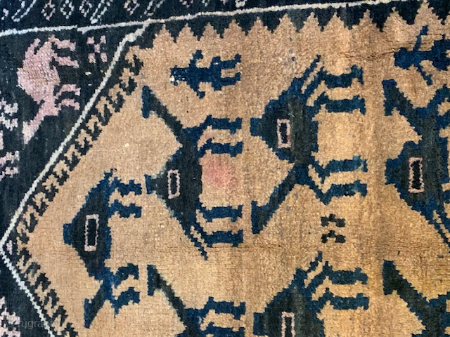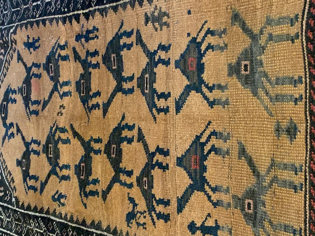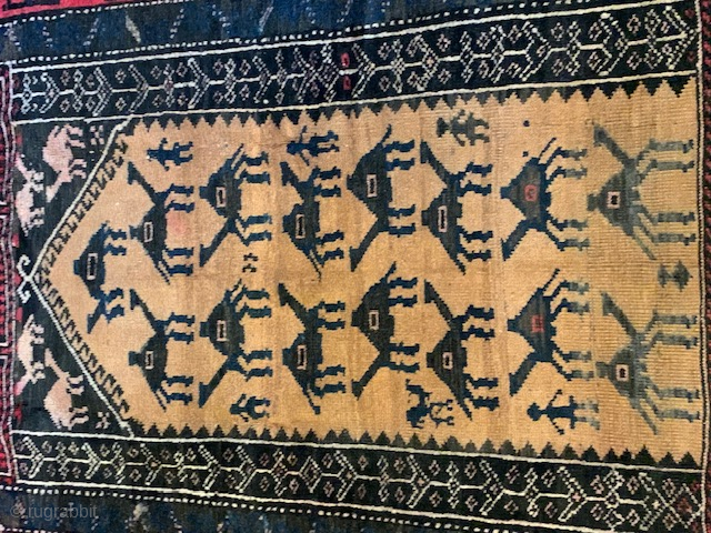 Unusual Baluch Prayer rug with Caravan of camels on a camel wool ground. Please Contact by emailing antiquerugs@comcast.net