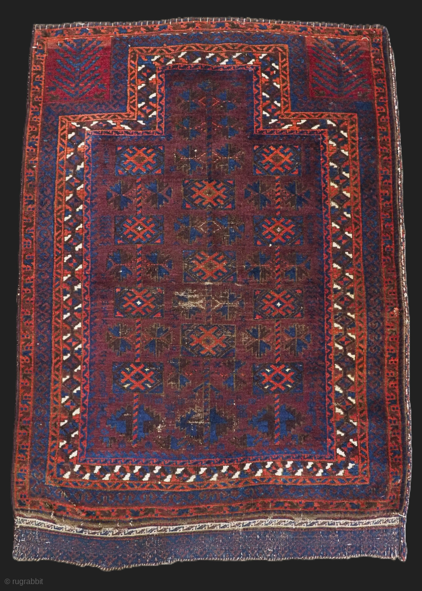 Antique Baluch prayer rug by the Yaqoub Khani sub tribe of the Timuri, with box design on a scarce aubergine coloured ground.