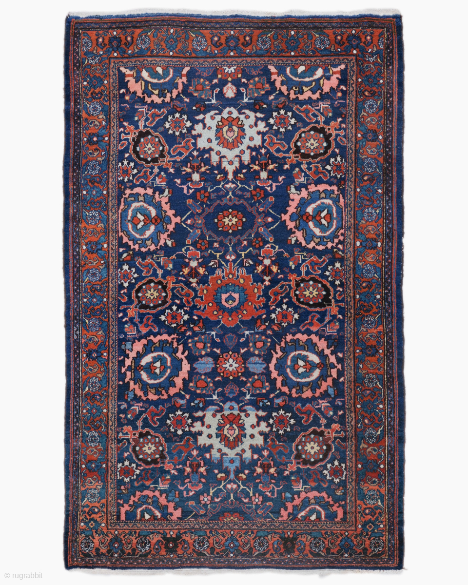 The color palette is masterfully balanced, featuring a primary midnight indigo field that serves as a dramatic canvas for high contrast shifts of terracotta red, salmon pink, and soft sky blue. These rich and enduring tones, achieved through the expert application of natural dyes over 130 years ago, exhibit a chromatic strength and a saturated depth that are hallmarks of the finest late 19th century workshop productions. The inclusion of a wide, terracotta ground primary border decorated with a rhythmic sequence of reciprocating floral rosettes and scrolling “s” vines creates a precise visual frame that highlights the superior wool quality and distinctive technical finesse of the weavers.