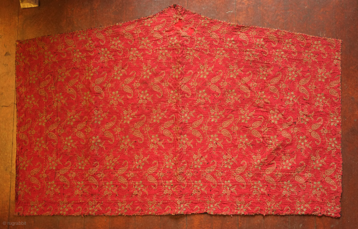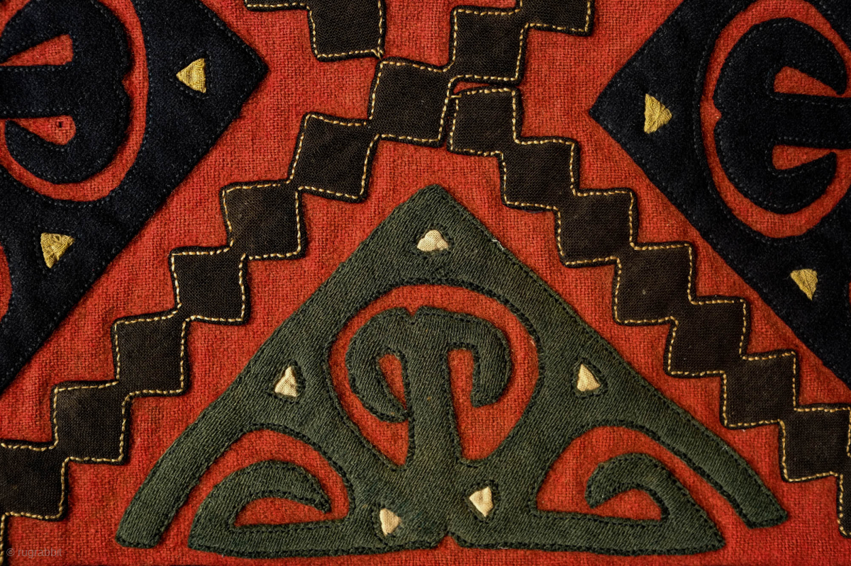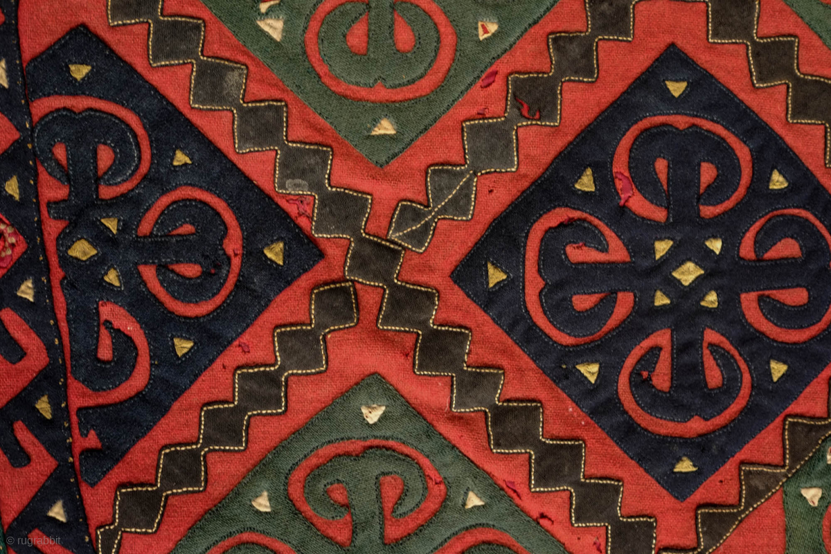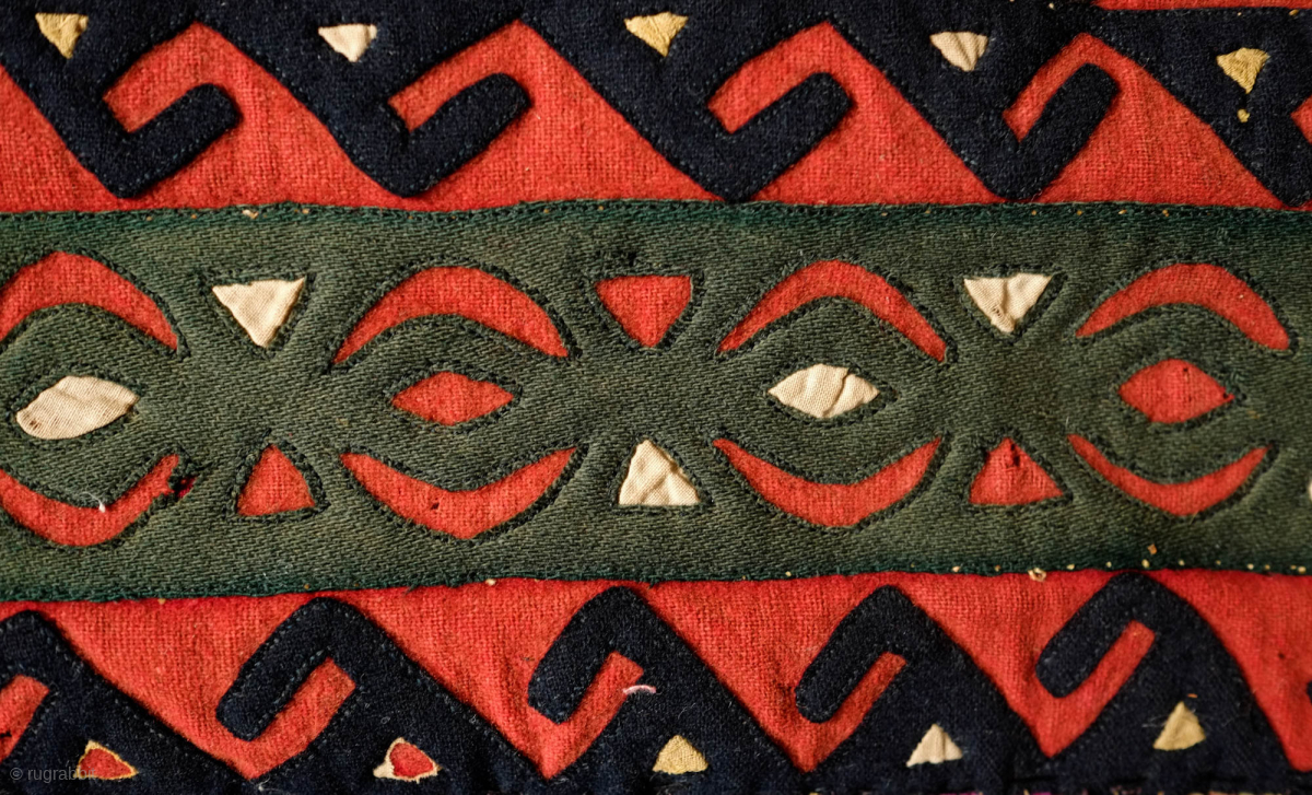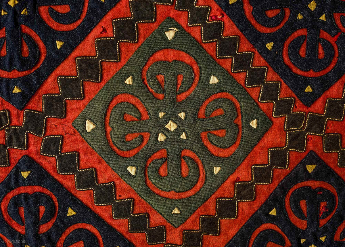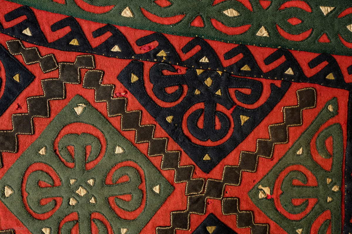Ersari Broad cloth Applique Asmalyk, 4th quarter of the 19th Century. Wool felt applique. Wonderful graphic. Saturated green, deep indigo, red, brown and cotton gauze highlights in yellow. It is backed with a wonderful Russian block print in a deep red. In very good condition but for a couple of very small moth nibbles which do not affect the visual of the piece. 70 x 106 cm. Contact danauger@tribalgardenrugs.com