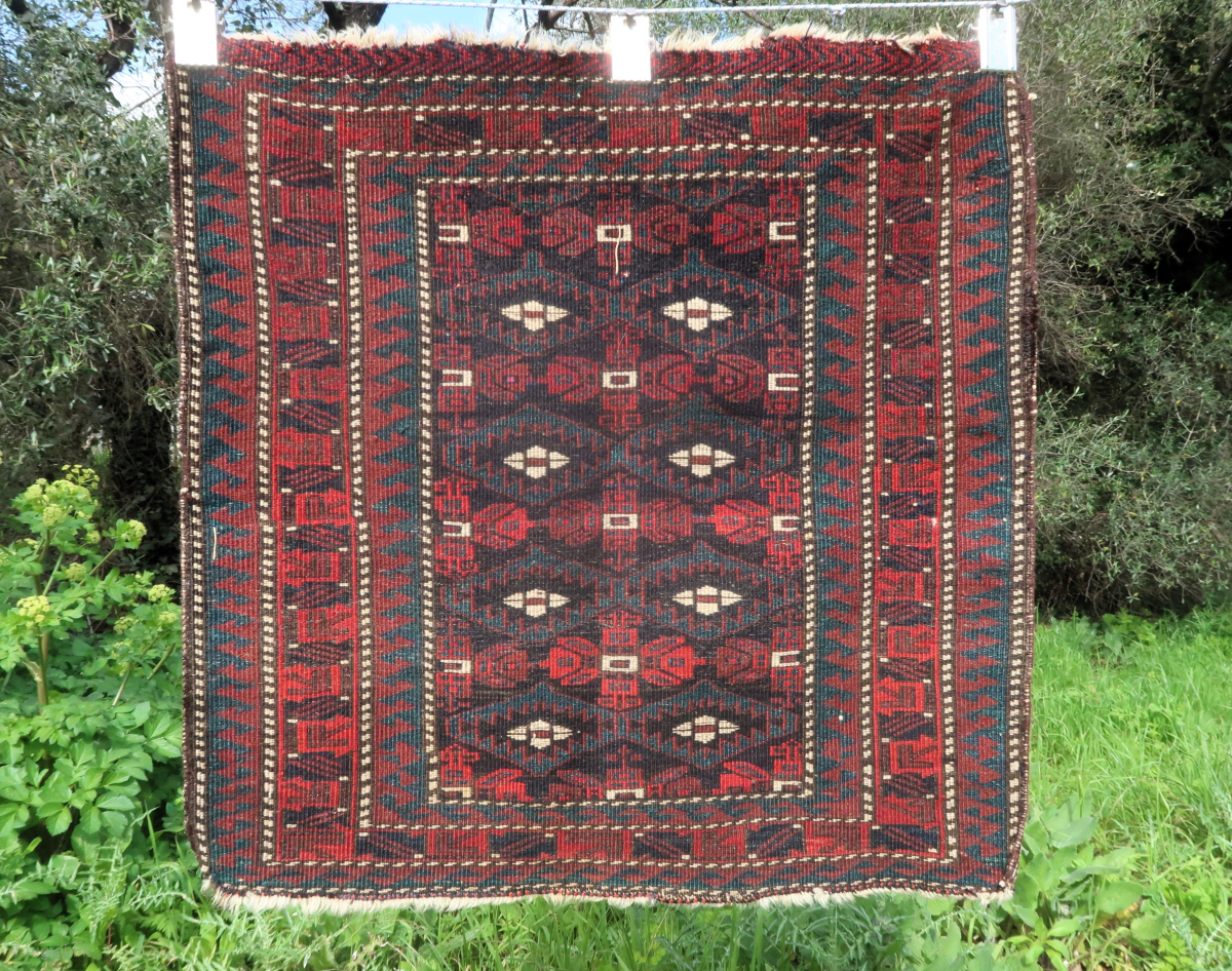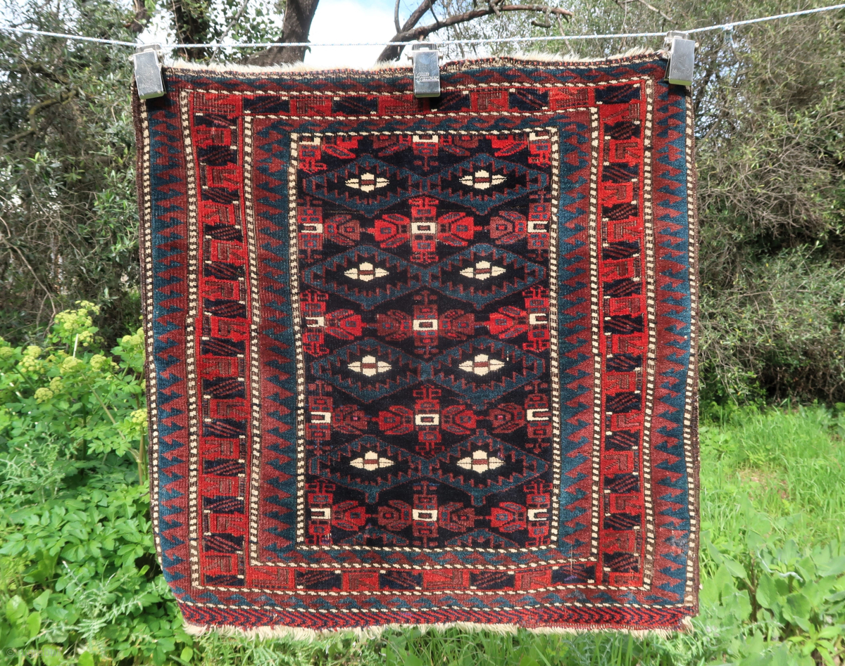 Colorful and old Baluch bagface (74 cm x 73 cm) Deep saturated colors, oxydized black, very small silk higlights. Very small moths bites, damages here and there. Overall good condition, with good thick pile. Please contact me directly on ygissinger@yahoo.fr Shipping worldwide at cost