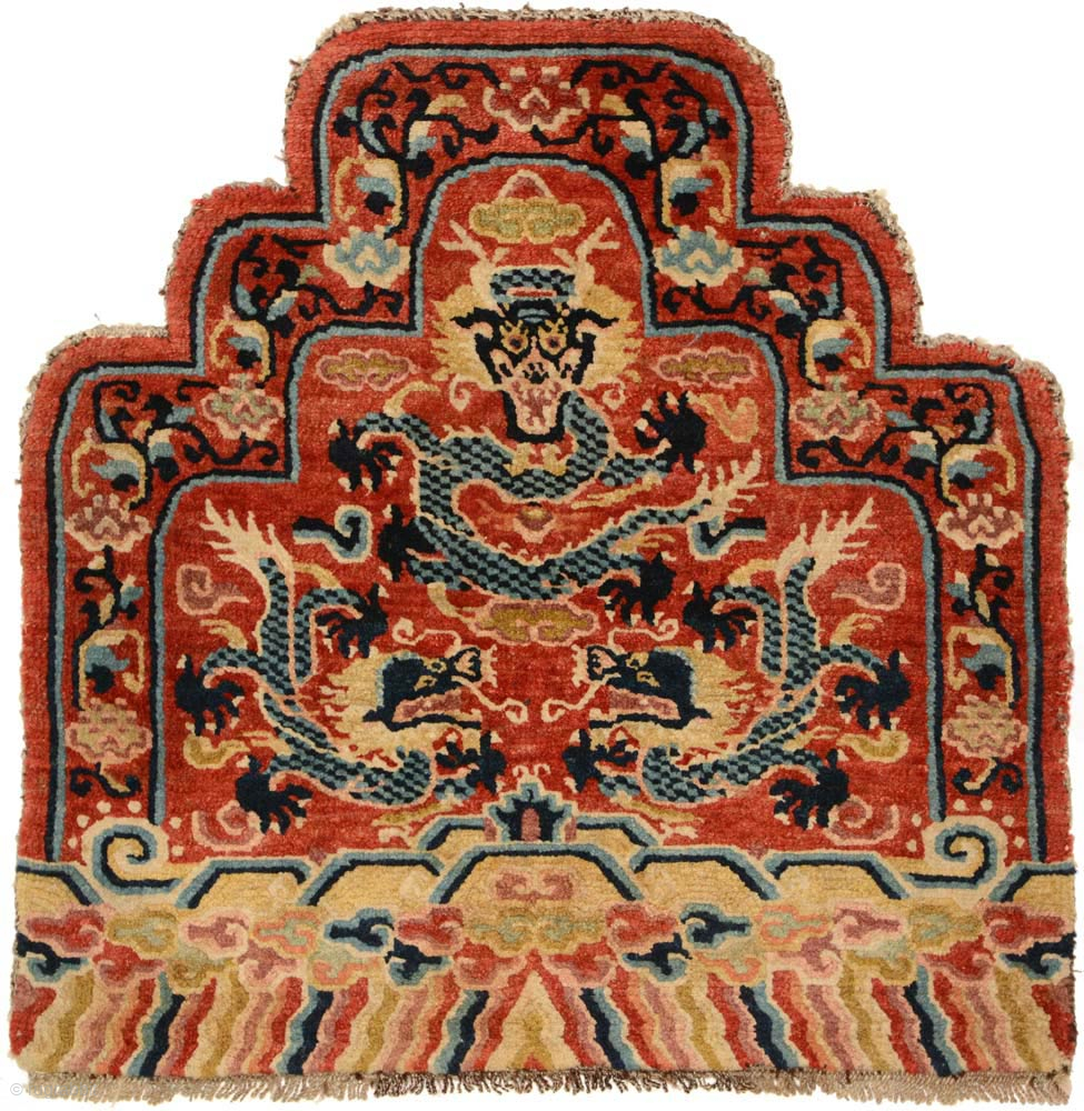 Rare Tibetan-knotted throne back or 'seating-back' carpet most likely made for a Buddhist lama associated with one of the 'red hat' Buddhist sects in Tibet. All three dragons are superbly drawn in the playful Tibetan manner, with the central five clawed main dragon seen 'face-on' looking directly out at the viewer with an exaggerated impressive grin, curly whiskers, long lion-like mane and 'antler-like' horns. His body is rather serpentine, and sports a dark and light blue checker pattern representing scales, as do the two smaller dragons which are seen in profile bowing in supplication. Made sometime in the early 1900’s using soft but strong, glossy Tibetan highland wool for the pile and weft, and the same wool and what appears to be yak or goat hair for the warp. The size is 73cm x 72cm (approximately 29in x 28in) and it is made with all, or predominately all, natural dyes. It is in very good condition and would suit any discerning collector. Please see more information and more photos here https://warpandweft.club/portfolio-item/other-tibetan-item-34/.