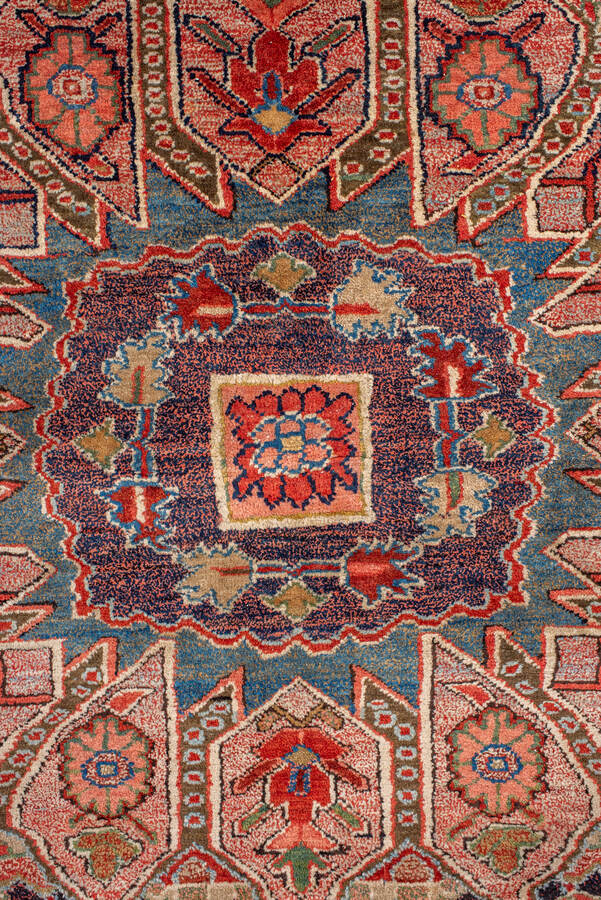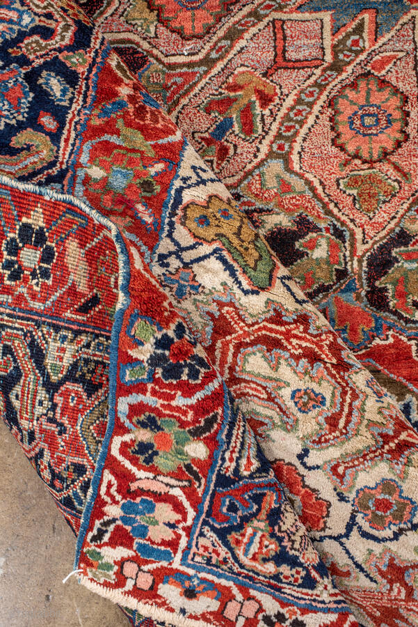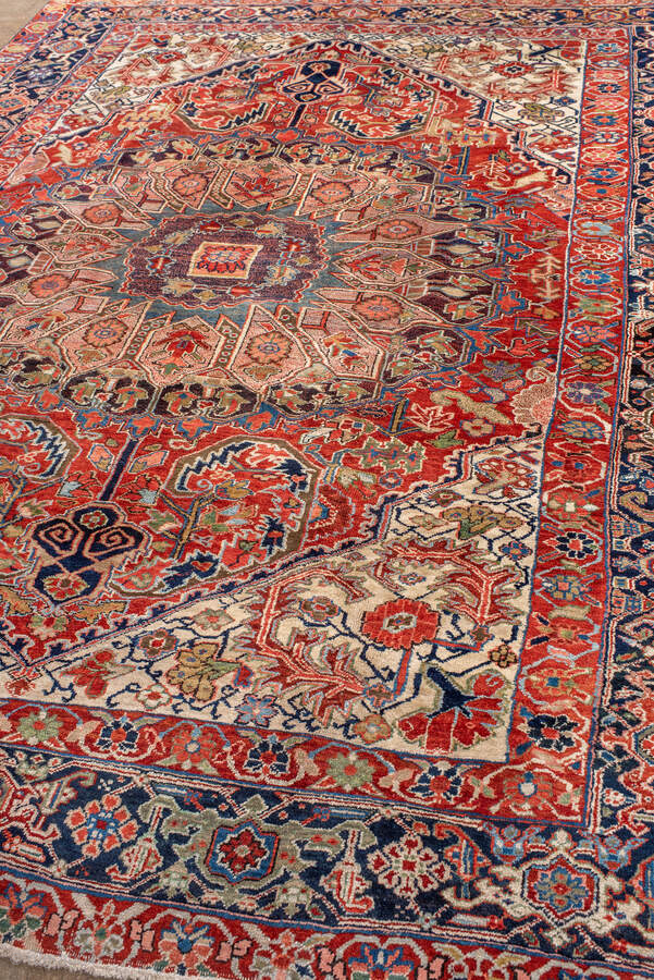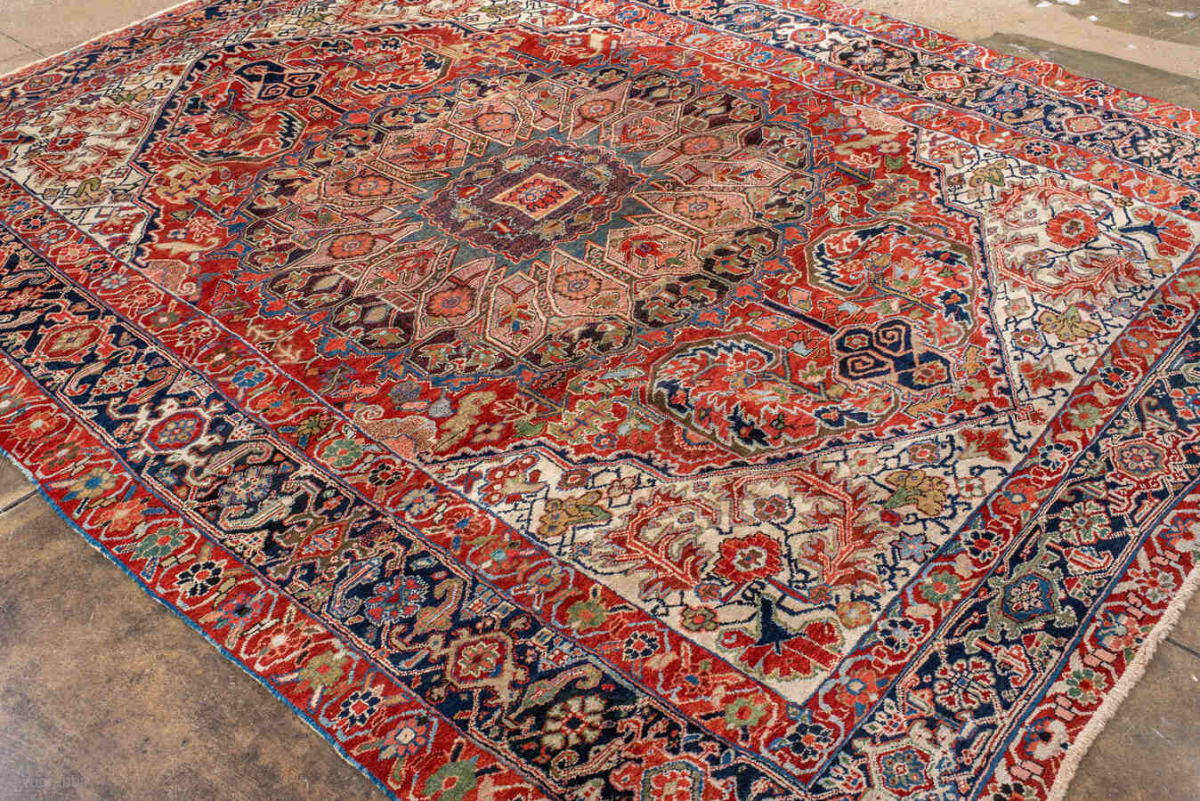 Antique Persian Heriz Carpet, circa 1900. Featuring a dramatic geometric medallion on an ivory field with rich red and deep indigo accents, framed by a bold Heriz border. Classic Northwest Persian design with strong architectural presence.
