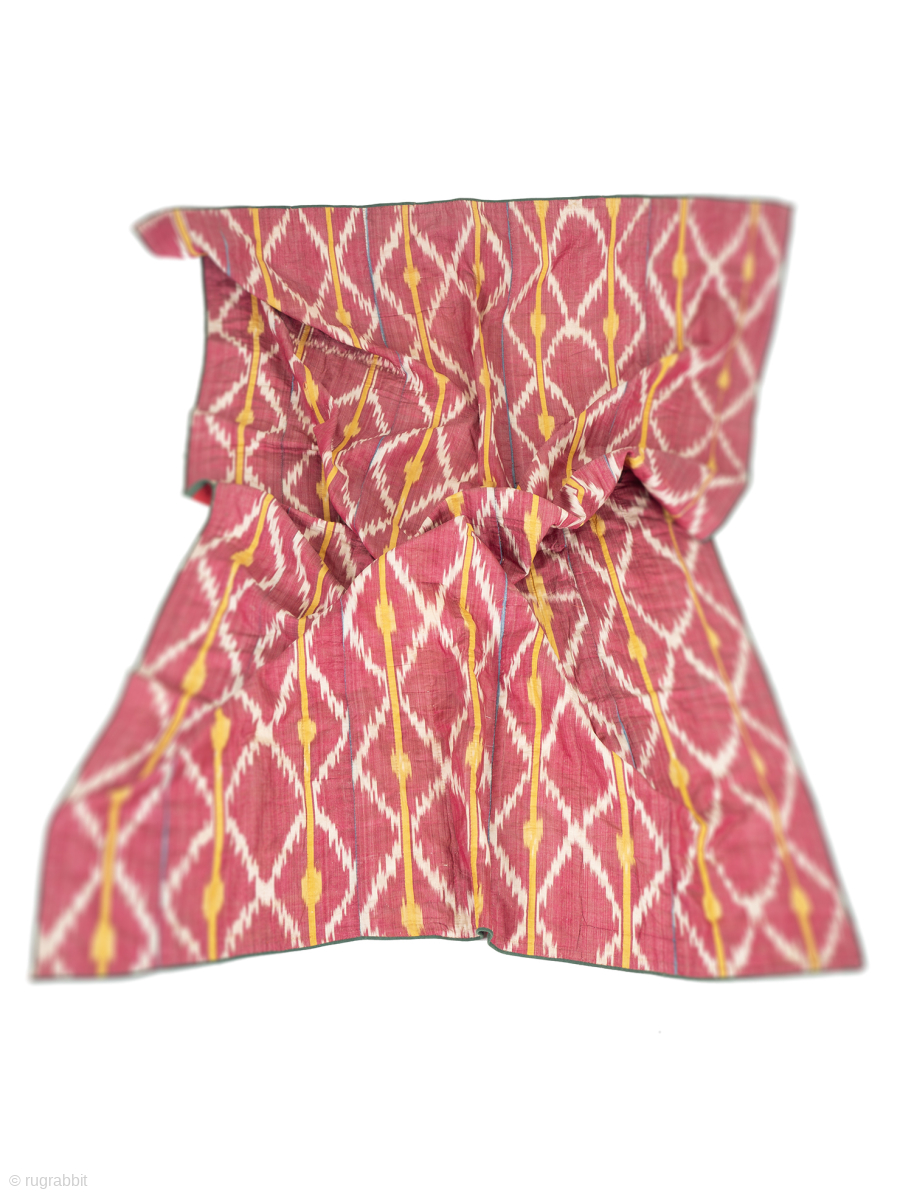 On a ground of rich violet pink, with a striking design of interlocking diamonds cut through with bold yellow bars. The pattern is disrupted at bottom right and top left with a pair of white lines running over the pink and the yellow, creating a pleasing and well balanced asymmetry. The textile is in remarkable condition, with only a couple of small marks (see listing on site for extra images and video https://www.rochecoward.com/product-page/large-19th-century-pink-ikat-panel). Being well lined it hangs well and feels substantial, lending itself for use as both a throw/cover or a wall hanging.