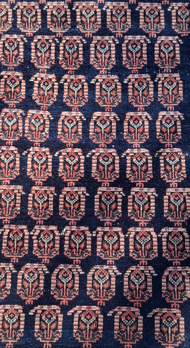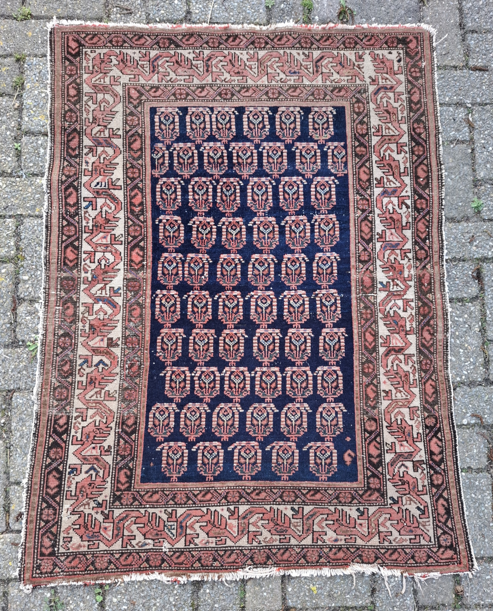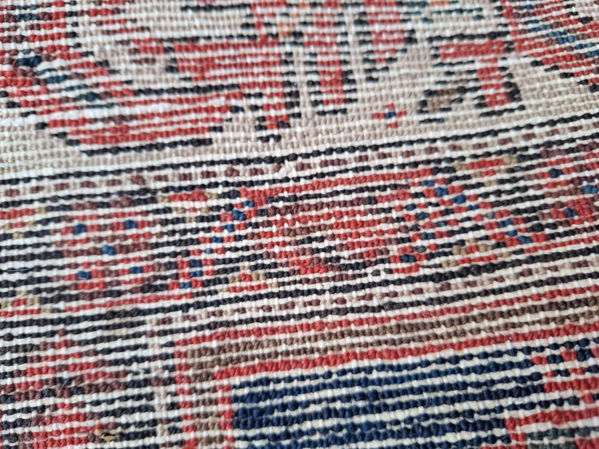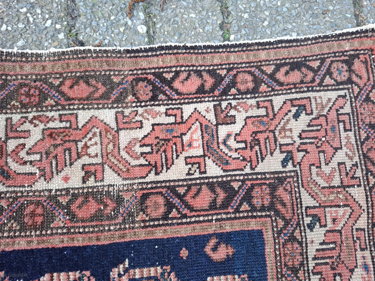 Kurdish rug, probably a masnad (personal rug). Size 143 x 107 cm. Displays stunningly. Gorgeous dyes in the border. Drawing has an Afshari feel, but this is most likely Serabend. Wonderful. Contact me at alexanderbakker@flairforflavor.com