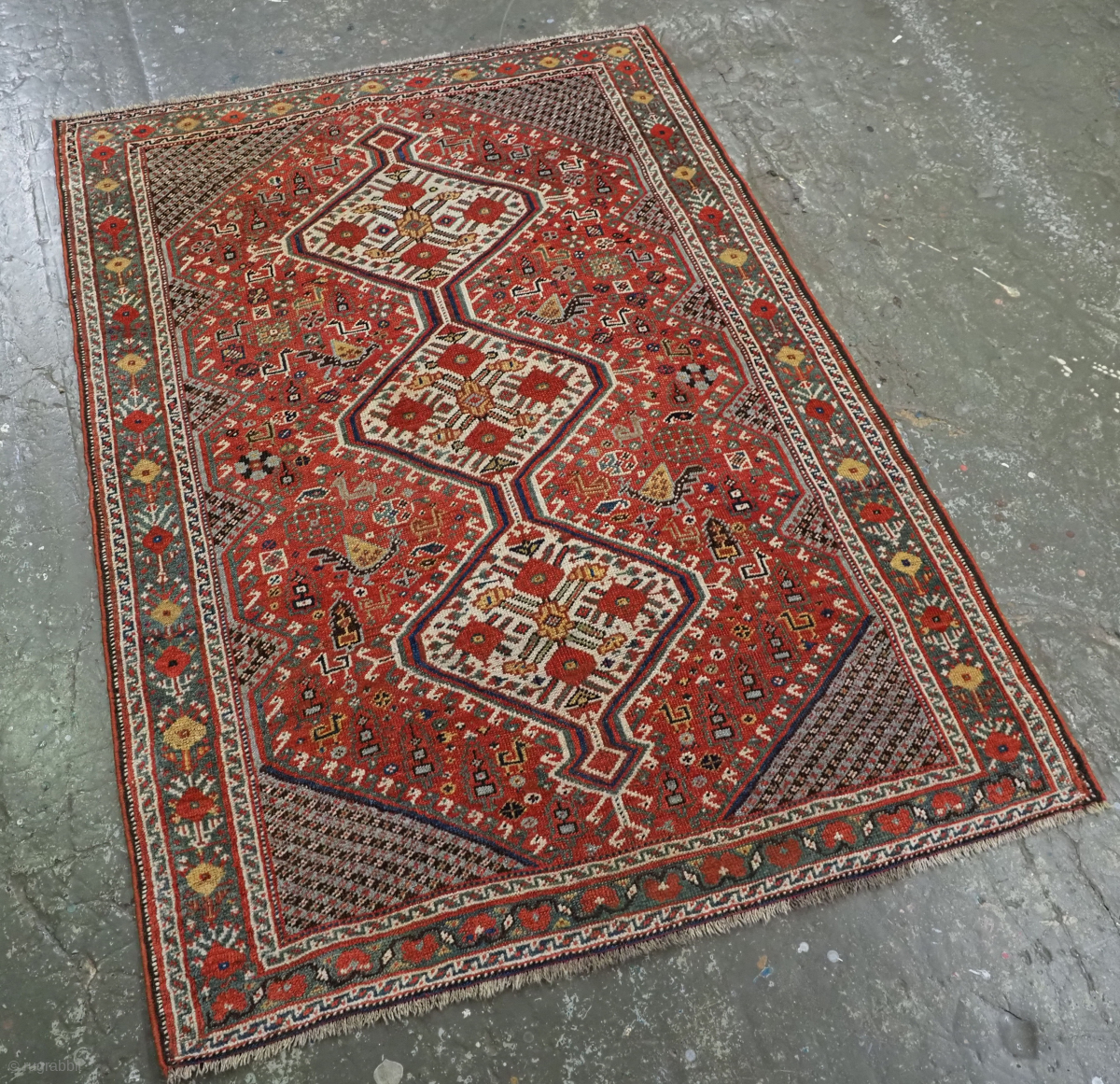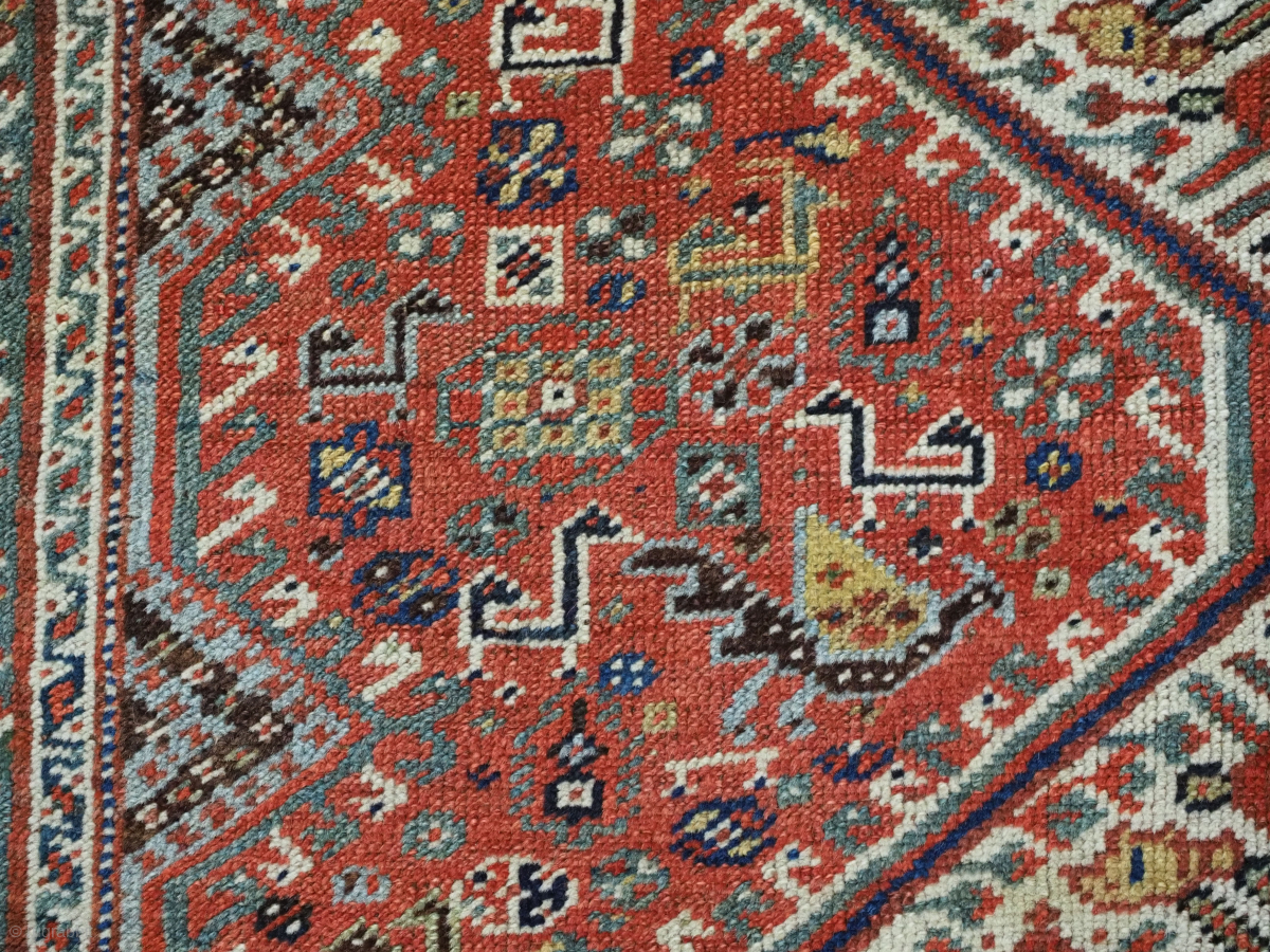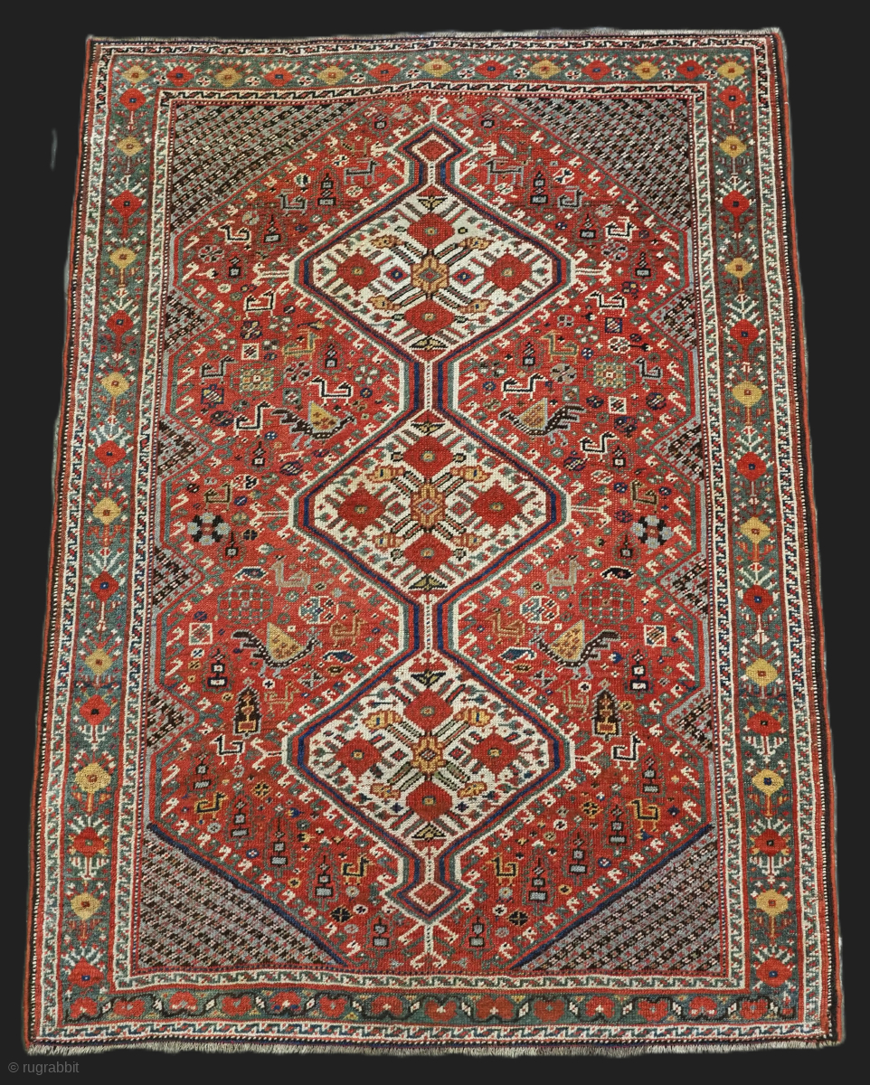 An excellent small tribal rug with a central ivory triple medallion containing pomegranate flowers; the warm madder red field is covered with small animals, birds and flowers. The rug is framed with an excellent border in soft green with small pomegranate flowers. Overall an outstanding small tribal rug.