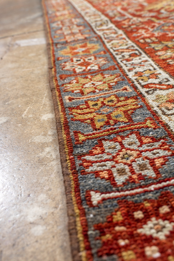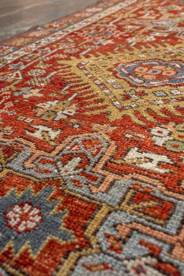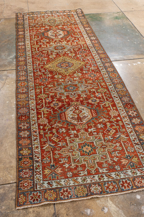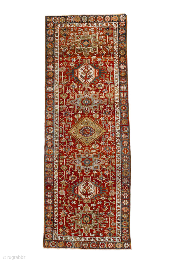 Antique Persian Heriz Runner, circa 1910. Featuring a series of bold geometric medallions on a rich red field with soft blue and ivory accents, framed by a classic Heriz border. Strong Northwest Persian village design with crisp, graphic detail.