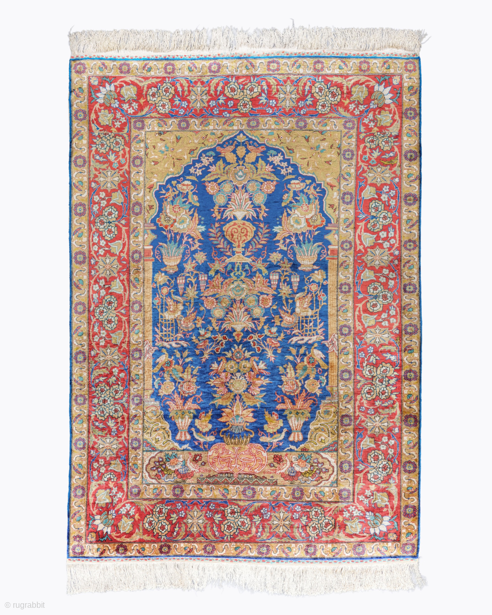 This rare mid 20th century Turkish Kayseri silk prayer rug highlights a powerful and rhythmic botanical composition featuring a classic Tree of Life motif anchored within a vibrant royal blue mihrab field. This structural balance between the central vase overflowing with intricate floral blossoms and perching birds and the elegantly arched prayer niche reflects the pinnacle of the Kayseri weaving tradition, which is world renowned for its sophisticated interpretation of classical Ottoman court designs. Silk rugs of this caliber are celebrated for their technical finesse, allowing for the painterly execution of delicate naturalistic details and the complex curvilinear patterns that define the region’s artistic heritage.