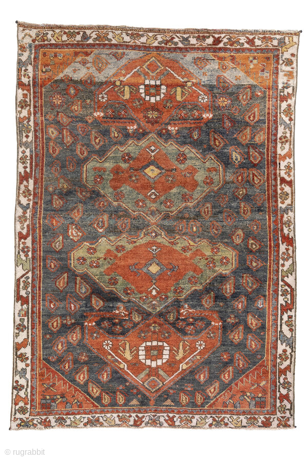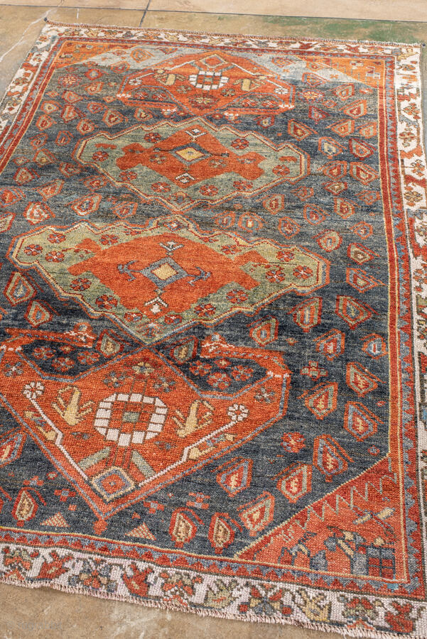 Antique Kurdish Rug, circa 1920. Featuring bold geometric medallions on a softly abrash blue-gray field with warm rust, ivory, and soft green accents, surrounded by a lively tribal border.