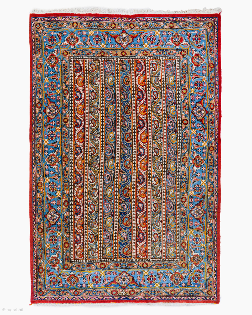 This rare late 19th century Persian Qum (Kum) rug highlights a powerful and rhythmic vertical composition featuring a sophisticated “Moharramat” or striped pattern anchored within a luminous ivory and sky blue field. This structural balance between the repeating vertical bands—each filled with a continuous sequence of delicate “Boteh” (paisley) motifs—and the surrounding curvilinear spandrels reflects the pinnacle of the Qum weaving tradition, which is world renowned for its extraordinary technical refinement. Rugs of this era are highly sought after by collectors for their painterly execution of complex botanical details and their graceful interpretation of classical Persian design elements.