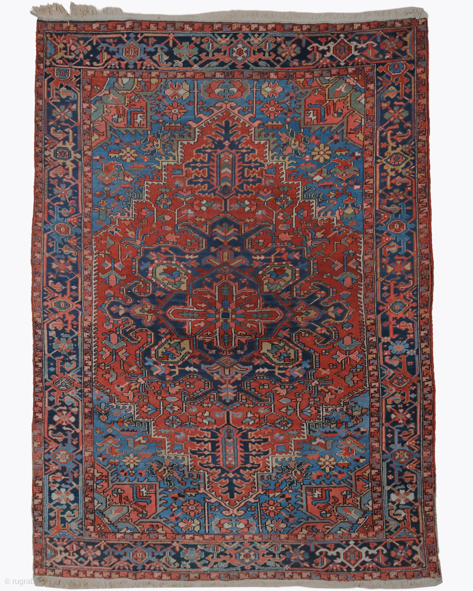 This distinguished late 19th-century Heriz carpet exemplifies the bold design language and enduring quality that have secured Heriz rugs a prominent place among the world’s most admired antique weavings. Crafted in the Heriz region of northwestern Iran, the piece showcases a commanding central medallion, angular geometric forms, and a harmonious color palette featuring deep madder red, indigo blue, and touches of soft ivory and sage.