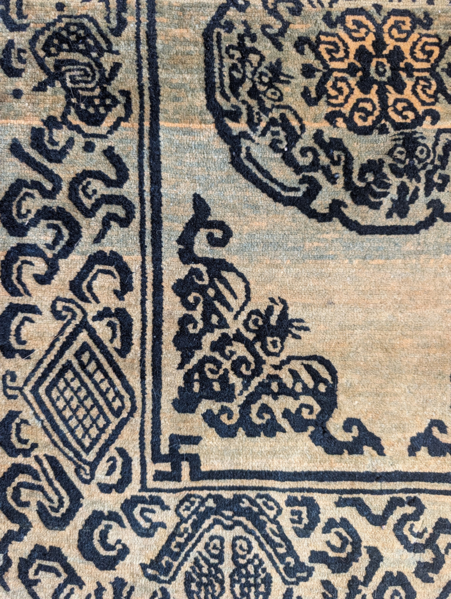 Small Tibetan rug with auspicious bats and cloudbands. Likely based in a Chinese textile design. Dramatic abrash, all natural dyes, great condition