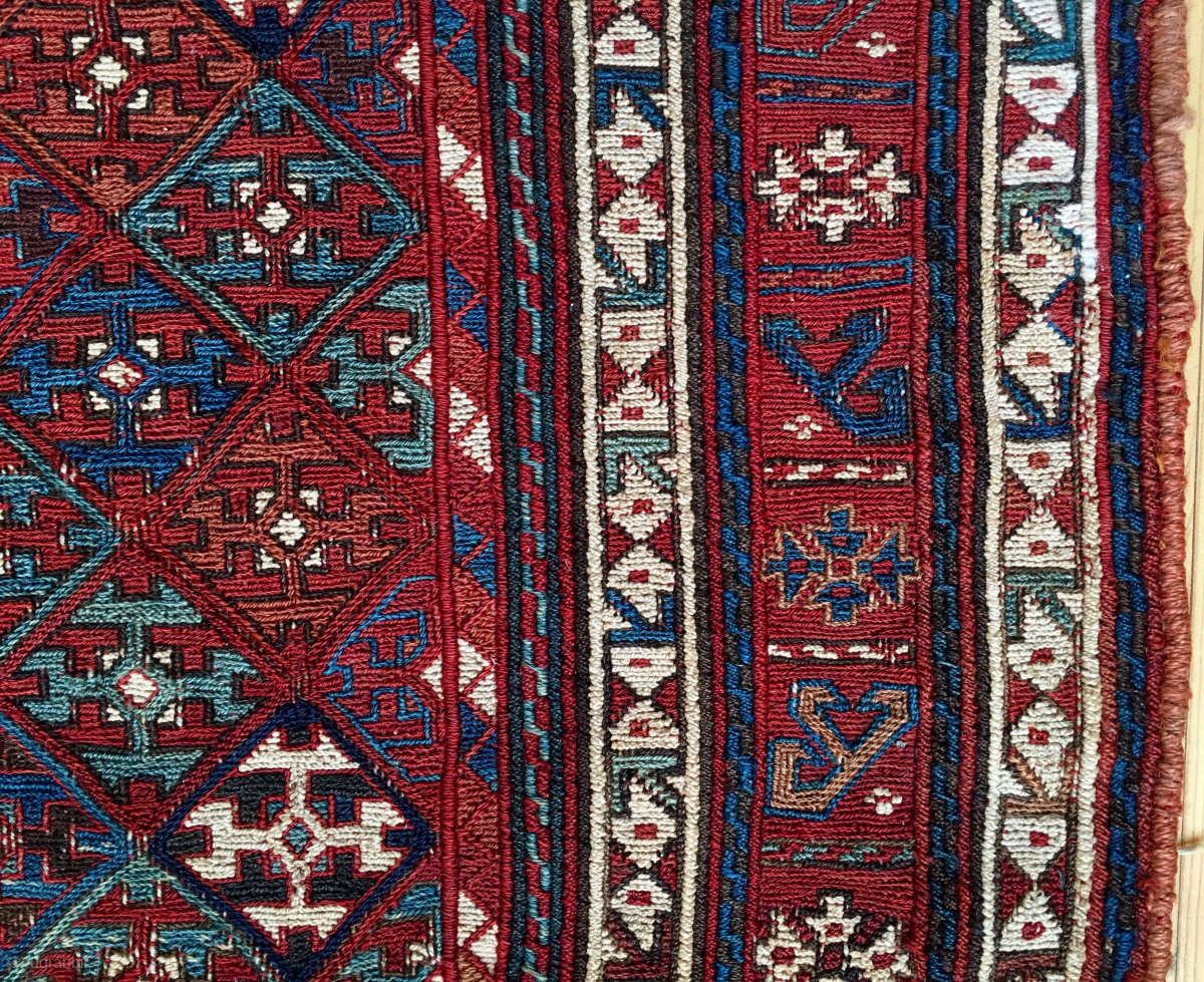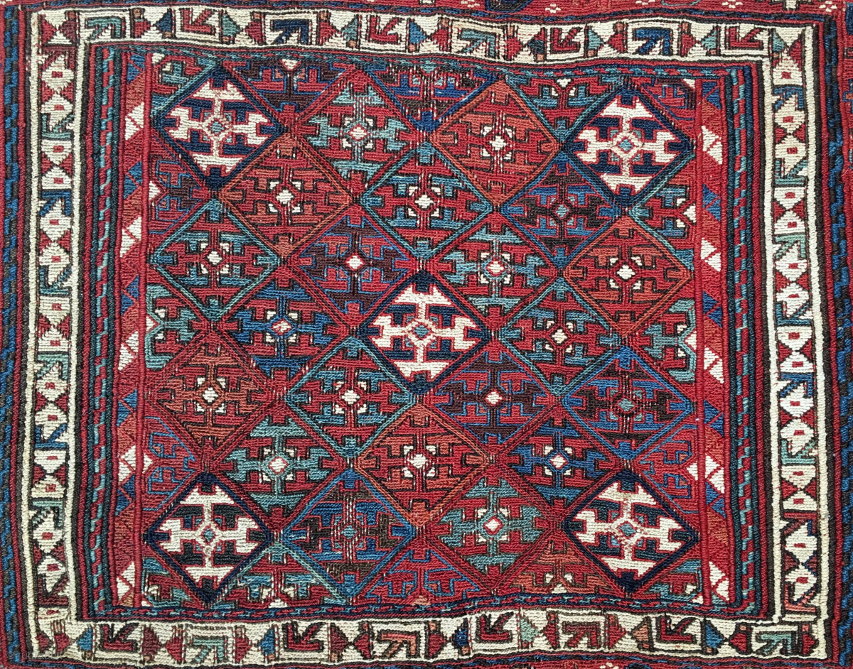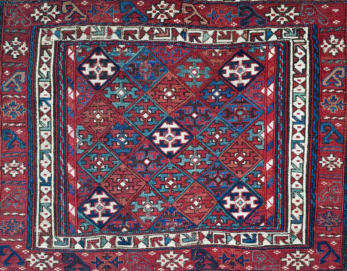 Very interesting diamond lattice main field with a repeating cruciform motif! Three unusual, awesome borders,...