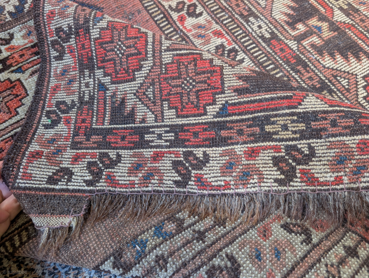 Not my typical listing, an old but not ancient mid 20th century Afghan Ersari prayer rug with super graphics and huge hands on top of columns. The red is hot and tip faded but the wool is nice and it has real goat hair selvedges and traces of the kilim ends. It has been stabilized.