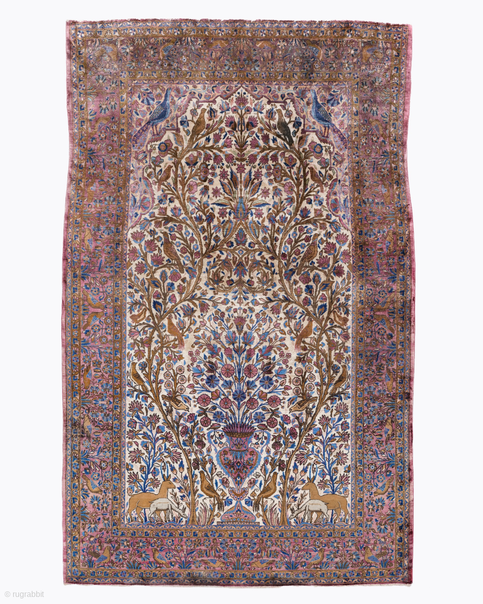 This rare late 19th century Persian Keshan silk rug highlights a powerful and rhythmic pictorial composition featuring an elaborate “Tree of Life” motif anchored within a luminous ivory prayer niche. This structural balance between the flowering branches filled with varied avian figures and the delicate gazelles resting at the base reflects the pinnacle of the Persian silk weaving tradition. Textiles of this era from the Keshan workshops are world renowned for their extraordinary technical precision and the use of sophisticated narrative designs that represent a distinct artistic language developed for global elite collections.