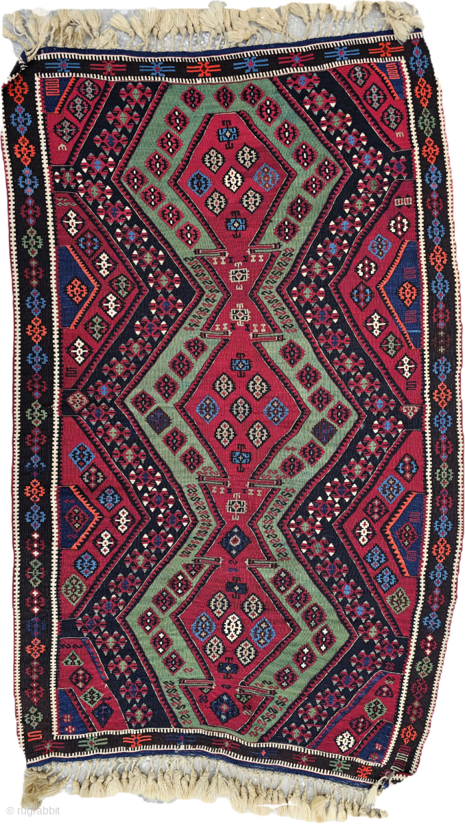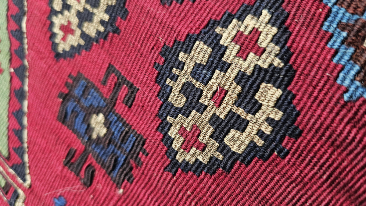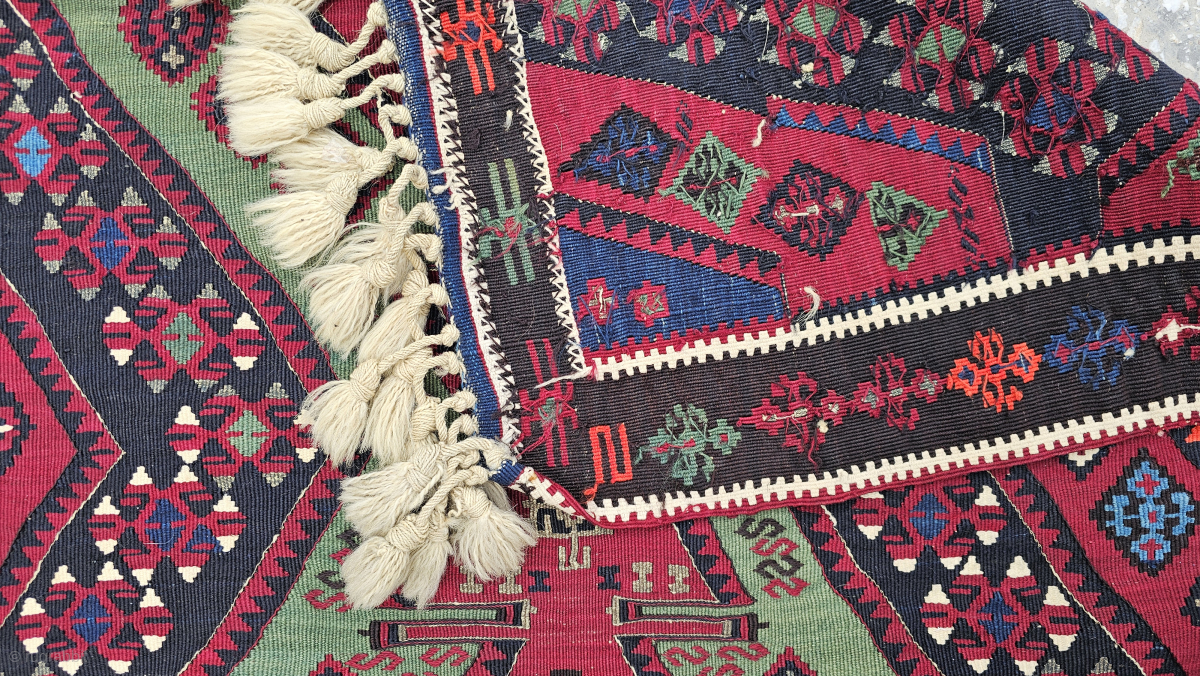 This mid-1800s Malatya Kilim is more than just a textile; it's a historical record of craftsmanship and prestige. What makes this piece truly exceptional is the use of metallic threads woven into the geometric patterns.