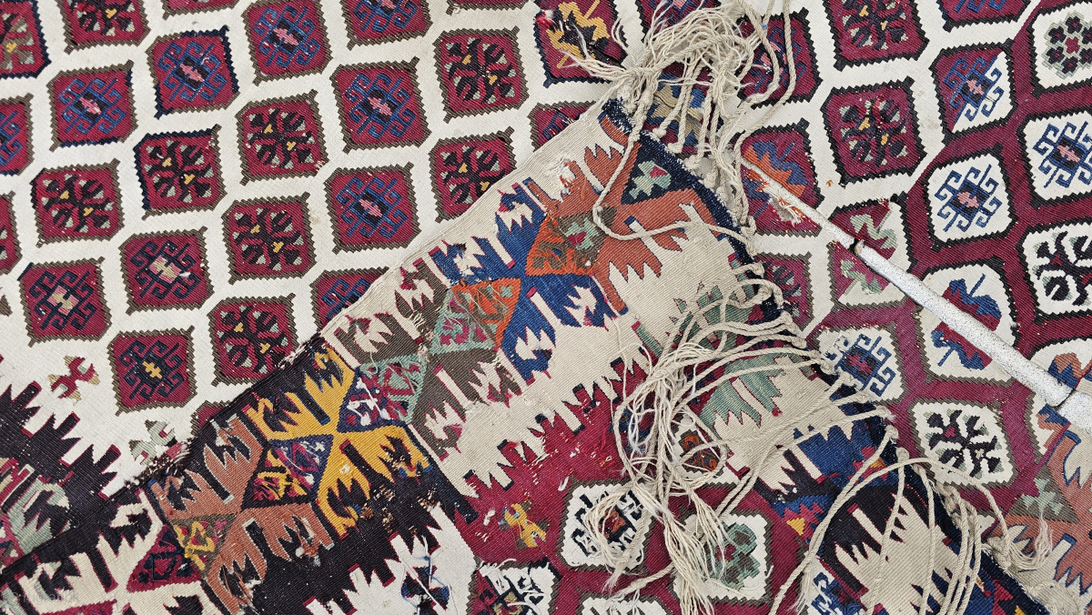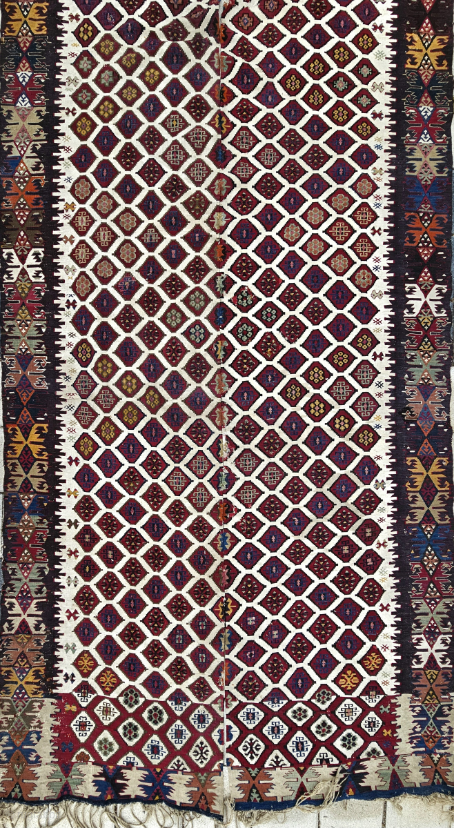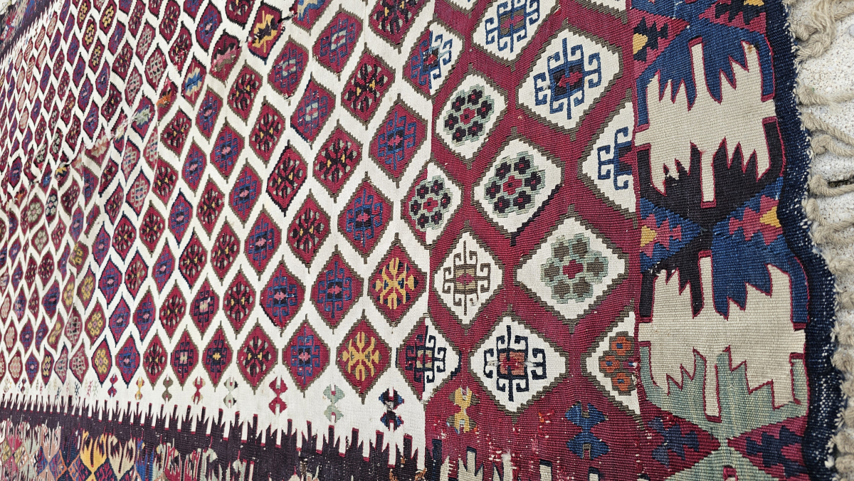 Some bonds never break; they simply change their form, stitch by stitch. it is a silent traveler from the early 1800s. These 'Petekli' (Honeycomb) patterns came to life between a weaver’s fingers in the dim light of a nomadic tent on the windswept plains of Reyhanlı. Each diamond motif was not merely a design, but a vow of devotion and a prayer for unity woven by the woman who sat at that loom through long winter nights. It is a lifetime story, captured in the scent of natural root dyes and the rhythm of the comb.The sharp hook motifs along the borders were woven like a protective shield for the hearth. Over two centuries, empires fell and the world transformed, yet the deep indigo and madder red never faded in their devotion to one another. Time has only matured its character, granting it the profound soul that only centuries of existence can provide.Holding this extraordinary heritage today in the heart of Cappadocia, i realize that as collectors, we are not the true owners of these pieces. We are merely companions, guarding these stories that someone once called 'home' until they reach their next destination. History isn't just written in the dusty pages of books; it is hidden in the knots of a woolen yarn and the delicate curves of a geometric pattern. This 200-year-old legacy, emerging from the heart of ancient Reyhanlı, is now ready to write its next chapter in a new home." Size ; 140x340 cm South anatolia, Reyhanli tribe... Detailed information Dm arisoylarmobilya@gmail.com