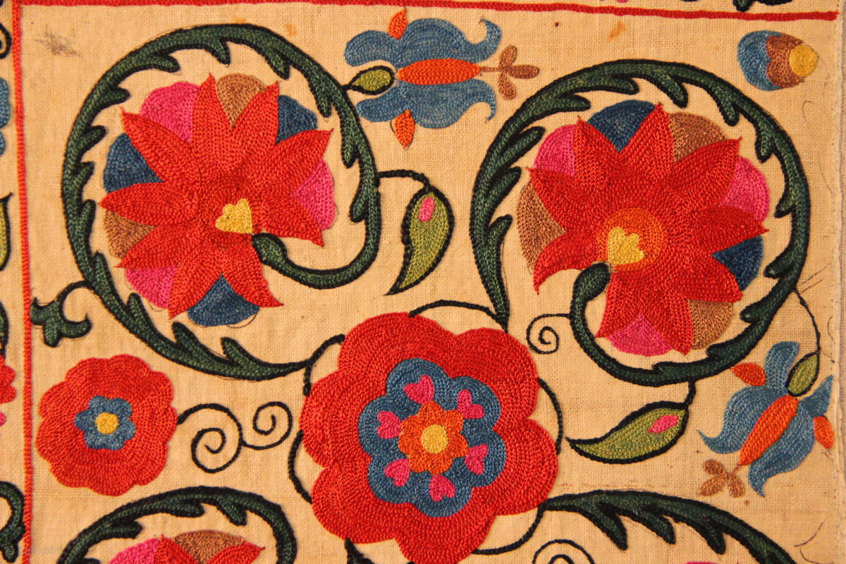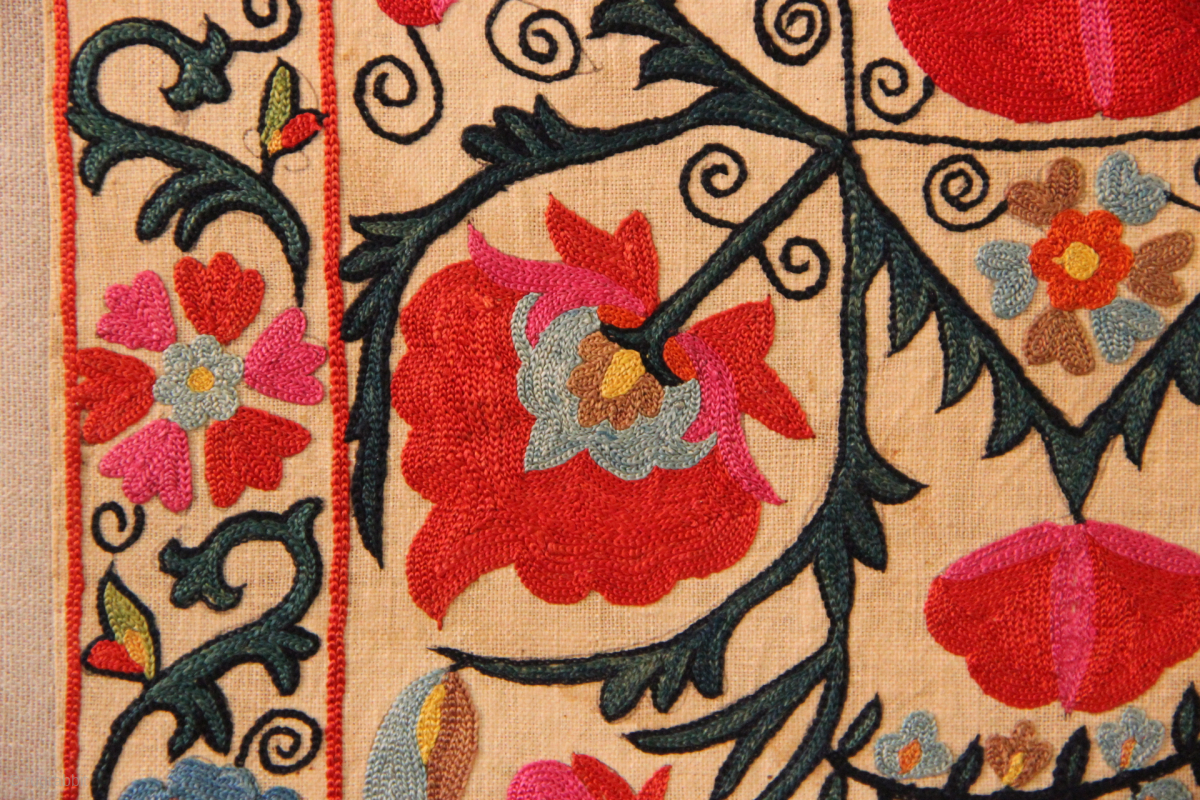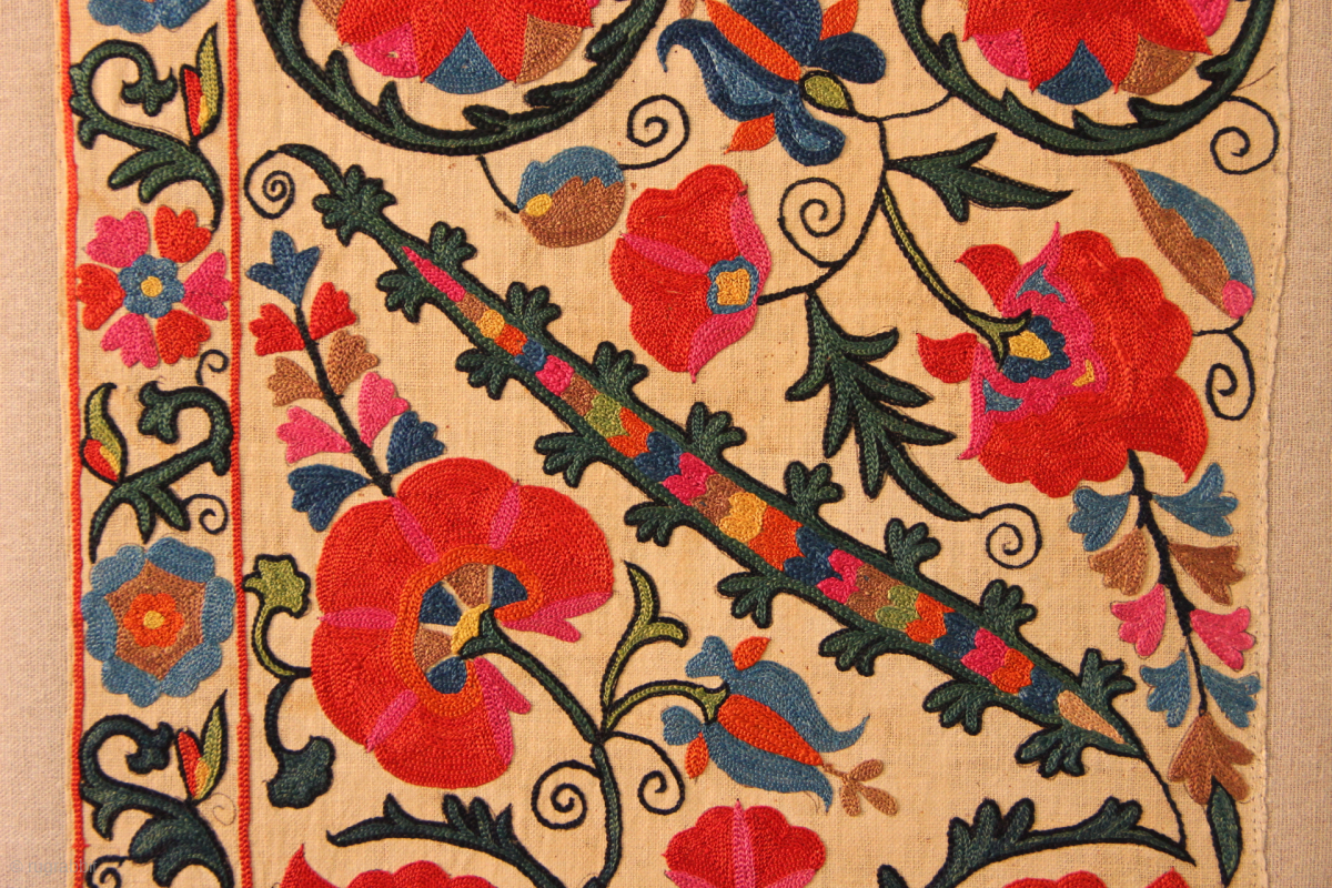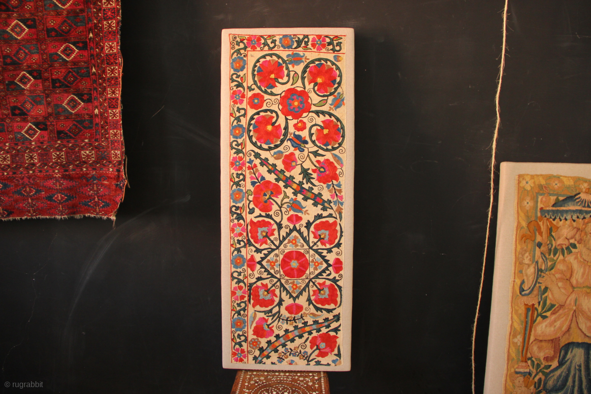 Mid 19th century Nurata Suzani border, mounted on a wooden frame. 38 x 101cm / 1'3" x 3'4"