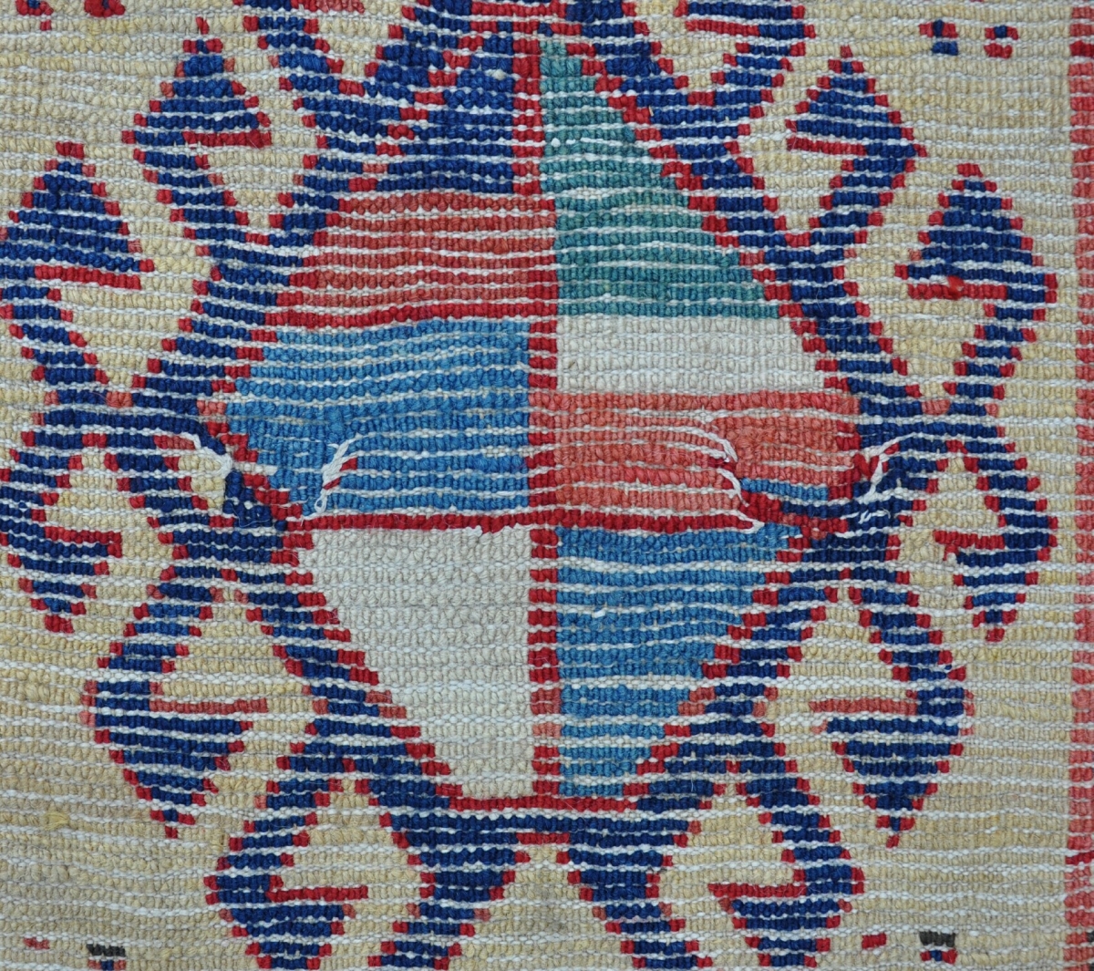 An antique Shassavan long rug with good clear dyes and beautiful wool in untouched condition, minor end border partially missing, but in full pile with original sides. a funky rug with floppy weave and yellow ground with cotton highlights. Very clean and floor ready. Circa 1880. 307x106cm