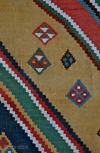 This kelim is in excellent condition, with only a few small re-weaves that are virtually undetectable. Original ends, sides have intermittent re-weaves to green border.