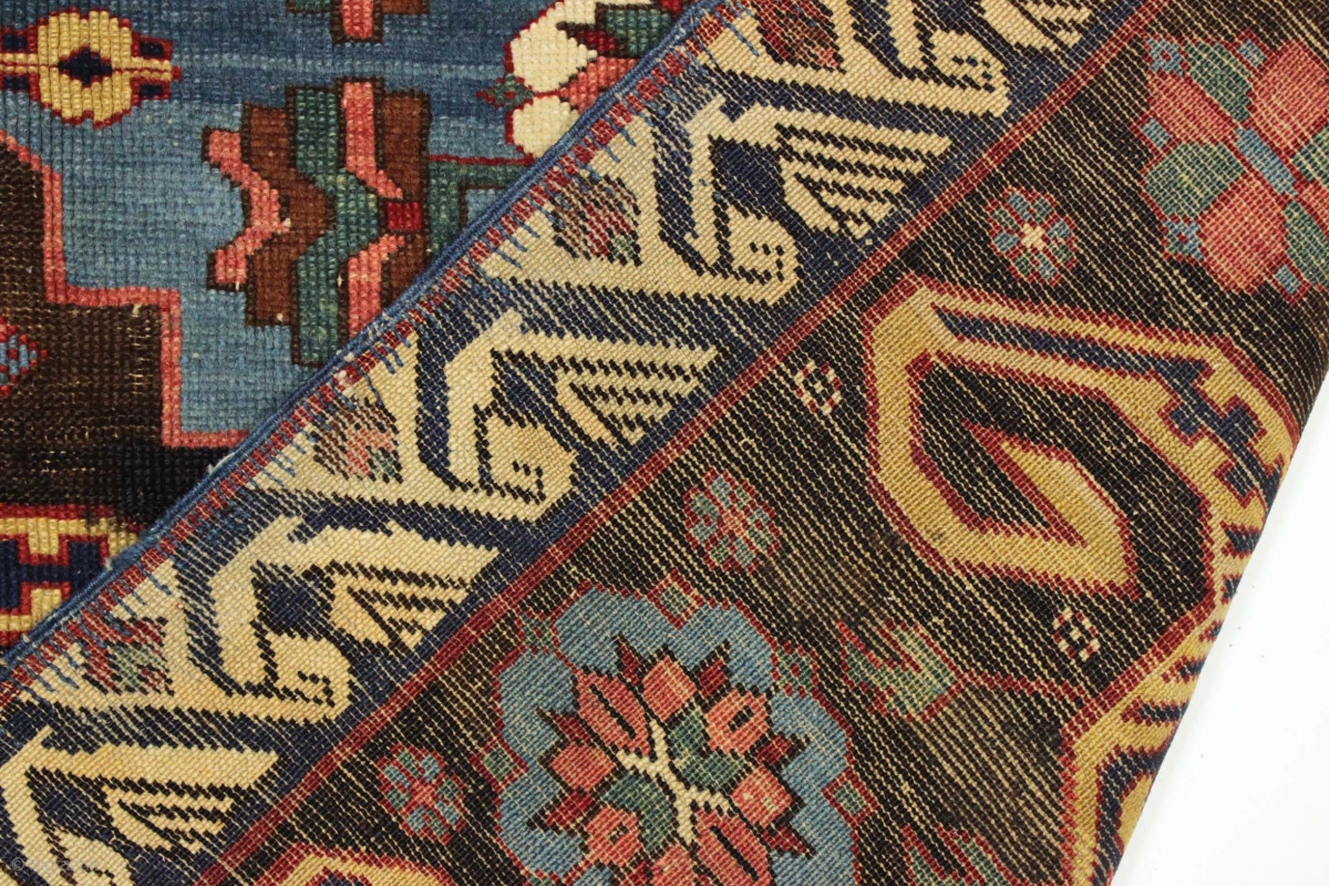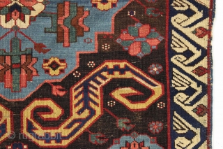 Antique caucasian rug. Eye catching and archaic drawing. Offered earlier in damaged state with numerous holes, now repaired. Not something you find often. 3'4" x 5'5"