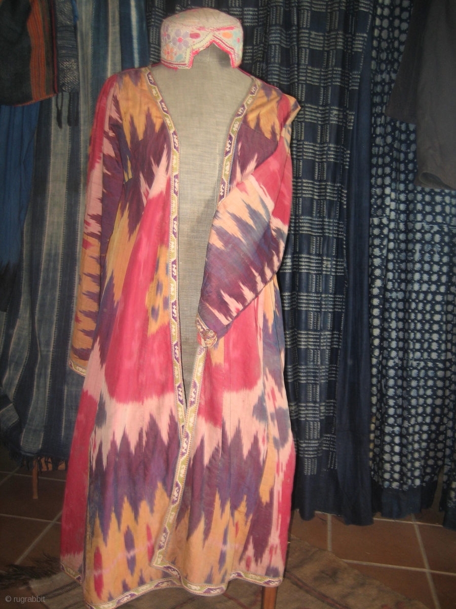 Silk ikat dyed coat (Chapan). Central Asia. Late 19th/ Early 20th century with fine embroidered front panel, original lining. Very good condition for age. Possibly made in Bokhara
