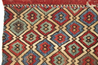 Pair of antique flat woven items. Turkish? Interesting waisted diamond designs. All natural colors featuring nice light blues, greens and purples. Good condition with no repairs. 19th c. each app. 14" x 16"