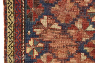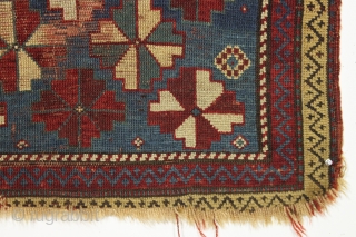 Antique small kazak prayer rug. Wild design. Dated and damaged. All good natural colors. Great restoration project. 2'11" x 5'1"