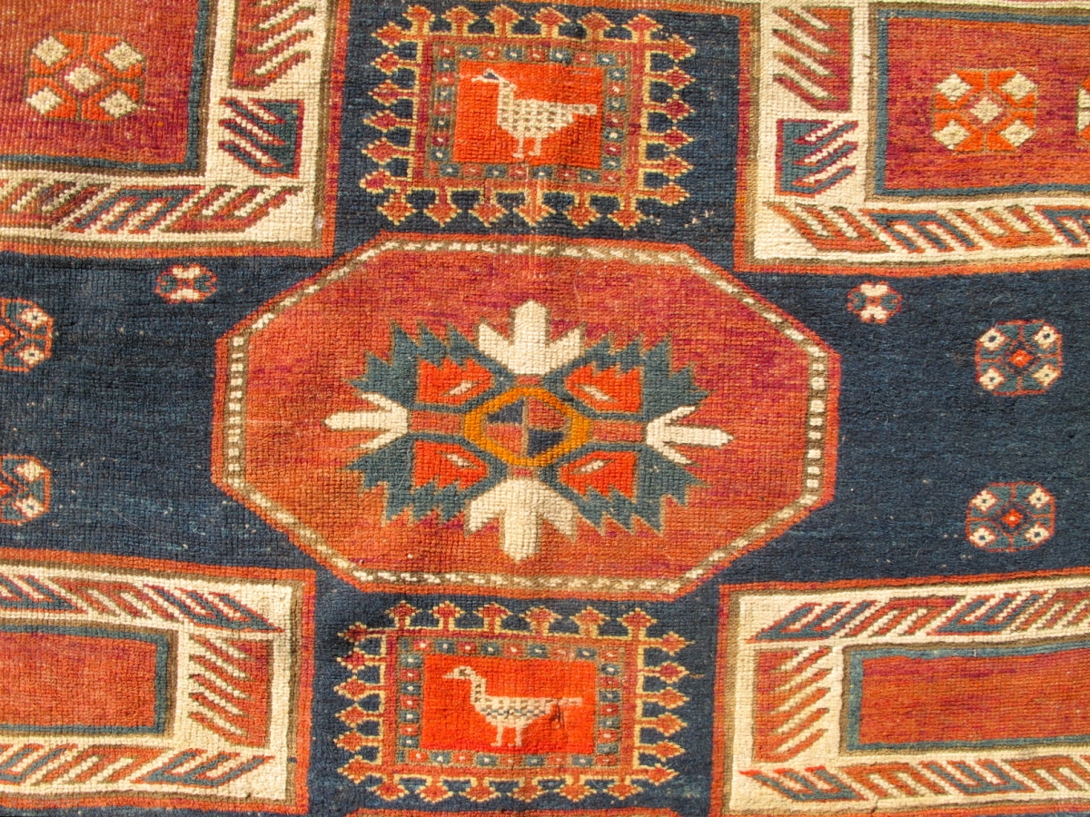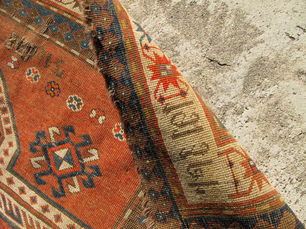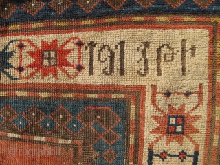This rug has an inscribed date as well as a name in Armenian script that is partly damaged in the field. Many would call this a prayer rug. i prefer to call it an altar rug as it was likely meant as a wallhanging tapestry at home or at a church altar. This type of rug is documented in Jimmy Keshishian's "Inscribed Armenian Rugs of Yesteryear." Jimmy labeled them "Shield" Design Kazaks and claims he has only seen two others in his life. Indeed they are extremely rare -- arguably rarer than the famous "Star Kazaks."