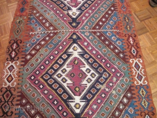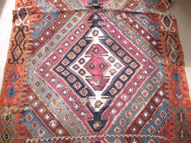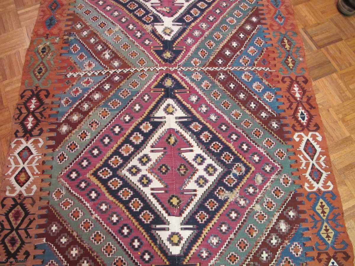 Very long antique Reyhanli kilim from Eastern Anatolia. Older than most with a very good color range and saturation including a great ox-blood maroon, two greens two oranges, at least three blues, madder red, cochineal and yellow. White is cotton but some wool as well. The superiority of color, fineness of weave and drawing suggest that this is an older piece than most of the type. There is scattered areas of old faded repair and the piece is cut and (mostly)shut but based on the long length i can't imagine that there is much missing. Sourced several months ago in Eastern Europe. (size is 15'x4'8" 458x142cm)