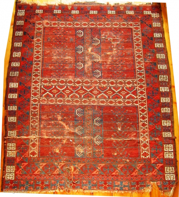 In poor overall condition, with repairs,fold wear, tears and a glue stain on the back. This is an interesting Ensi with good colours,which has archaic drawing and shamanistic secondary motifs. The lower guard border of the central panel is asymmetric, extending further on the left side than on the right.