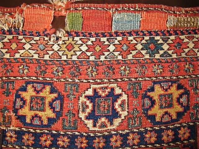 Shahsevan Sumak Bagface with a Leshghi Star Design, Old, Colorful, Thin, Beautiful. Difficult to accurately photograph. a small bit of silver thread in the center. 24"x26"