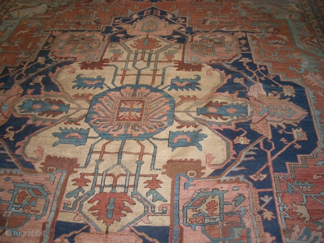 a very early Heriz Serapi carpet with highly desirable palette of tones. About 11'x14'4" = 336x437 cm. Repair galore!
