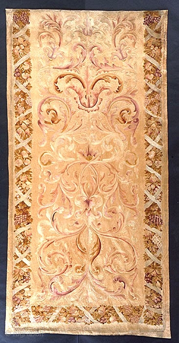 a luxurious silk embroidered panel; France or Italy, c 1730-1830, 4.9x9.4 feet, 145x284 cm. All-over silk satin stitch; likely one of a set from a State bed or series of wall panels. The upper end was intentionally designed without a border, as it is typically hidden by a valance. Several dyes and delicate feathered shades have been employed to enhance the shape, depth and vigorous movement of scrolling acanthus leaves. Purchased in Lugano, Switzerland in 1987.