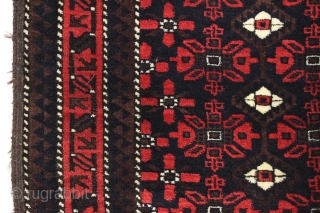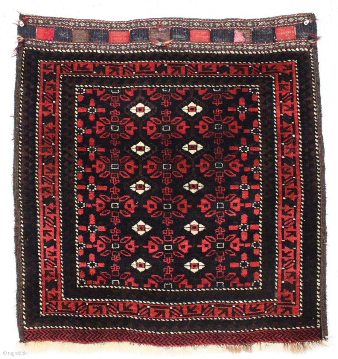 Antique baluch bagface. Perfect condition with full thick pile and tight weave. All rich natural colors and lustrous wool. Small flat weave repair on closure tab as shown. i considered ca. 1800 but decided on ca. 1900. 29" x 30"