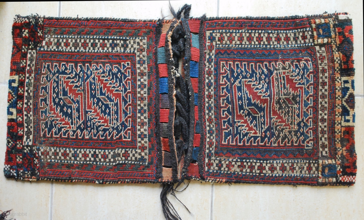 Antique dragon-design Bakhtiari saddle-bag, late 19th c. 33 x 92 cm. Wool and cotton white. Worn back-design.