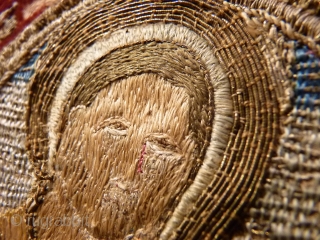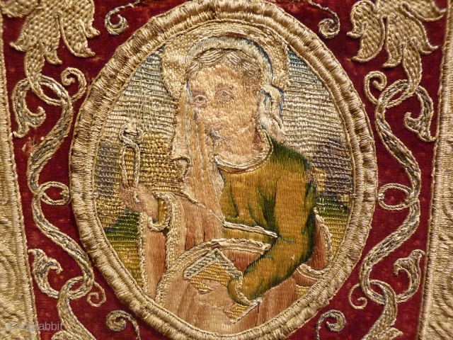 La casulla (casula, planeta) es una vestidura litúrgica, con la que se reviste el sacerdote para la celebración de la misa. La banda frontal y posterior de una casulla ricamente decorada, es el orifrés, como es el caso de este textil. Los bordados están recortados y cosidos sobre el terciopelo y rodeados los contornos con fino cordón de seda y oro. Los rostros están dotados de gran realismo gracias a la delicadeza empleada en su ejecución.