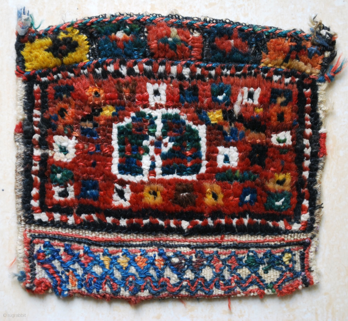Antique tiny little Luri bag-face. Prob. late 19th c. 20 x 20 cm. The white pile is of cotton. The closing end squares are pile knotted. Nice colours. Good condition.