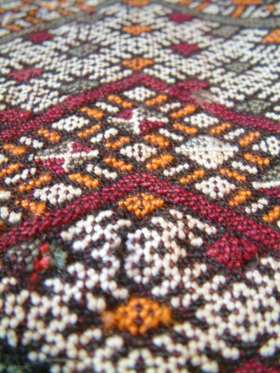 Due to the age there is a small amount of wear at one end, (see photos), but the main part of the kilim is in excellent condition on both sides. The small hole near the opening could be repaired with an able hand if you wanted to use this as a cushion. It would also be possible to unpick the stitching along each of the long sides to create one large wall hanging.