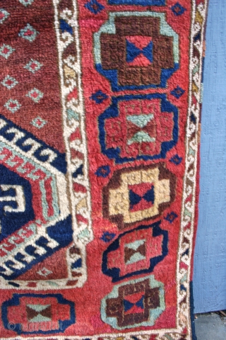 Early Adiyaman Kurd / 1st Qtr 19th c. i am calling it Adiyaman, as that is what Dr. Boemer calls the similar one that he has in his book with Bruggeman, pl. 92, page 293. It is finely woven and really focussed on color! You will see the exact same rug in the 5 volume set of Vakiflar rugs published by the Turkish Ministry of Culture; vol. 5, pl# 0595. The rug is early 19th century, and so is this one. The weave on mine is incredible and the pile is full and lush in most places, which is a must for these rugs. On this one the side guards have been restored on both sides. In the Vakiflar catalogue it attributes the rug to a "private collection"; so i am pretty sure that as it shows up again in "Boemer", it may be the editor's rug! To me, this rug is all about color, and specifically the relation ship between the colors blue and red. Even in the one gol where she makes just half of it with this amazing red, she does the other half in Lilac. There are at least 5 different hues of purple / violet in this rug, and all are wonderful! Also, the weave is just amazing in it's quality and precission. The woman who made this was really an artist and she was "anticipating" 20th century modernism with her use of color,,,,in my opinion,,,,,,, or rather this is what those artists were inspired by? size: 8' x 3'2".