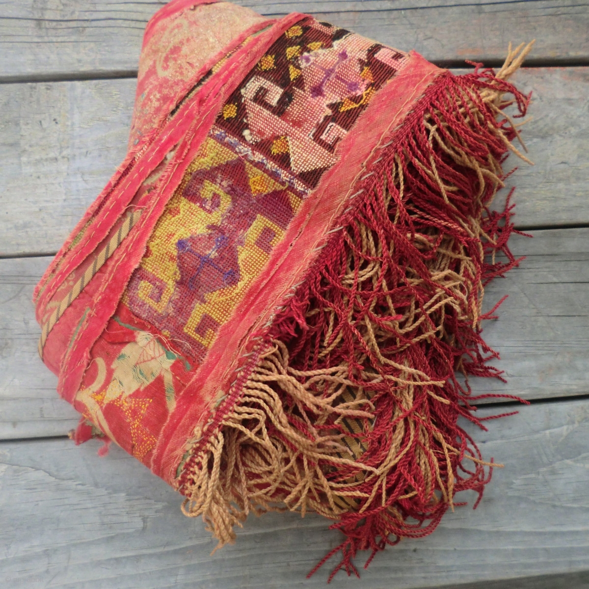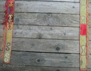 i acquired this door surround in 1971 as part of a Lakai collection of textiles, among them several Mafrashes and Segushas. All of them old and very beautiful. This piece, like all the rest was lined with antique ikat. Unfortunately 40 years later the ikat has disintegrated from old age, Structurally the piece is sound but it does have some condition issues. There is some silk cross-stitch embroidery missing, some fading, especially in the wool felt. Plus there are several small holes. All fringes and piping is original, and other than the silk ikat nothing has been removed or added.