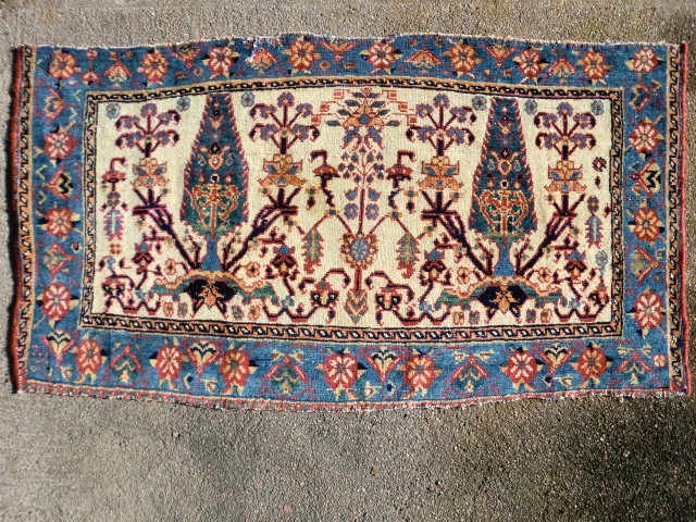 Afshar bagface with cotton warps. Approximately 1'1"x 2'9". Excellent wool and natural dyes, with losses top and bottom. Replaced selvedges, small stabilized hole upper left corner.