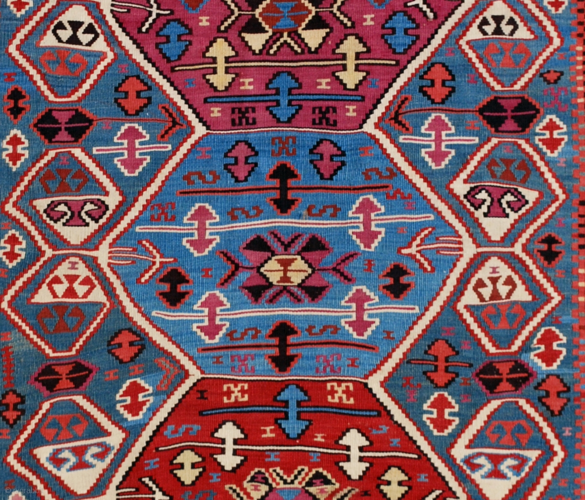 c. Anatolian kilim, 19th c. 140 x 396 cm. Very good natural colors. Very good condition except for two smal tears (at one end and in the center of a brick hexagon).