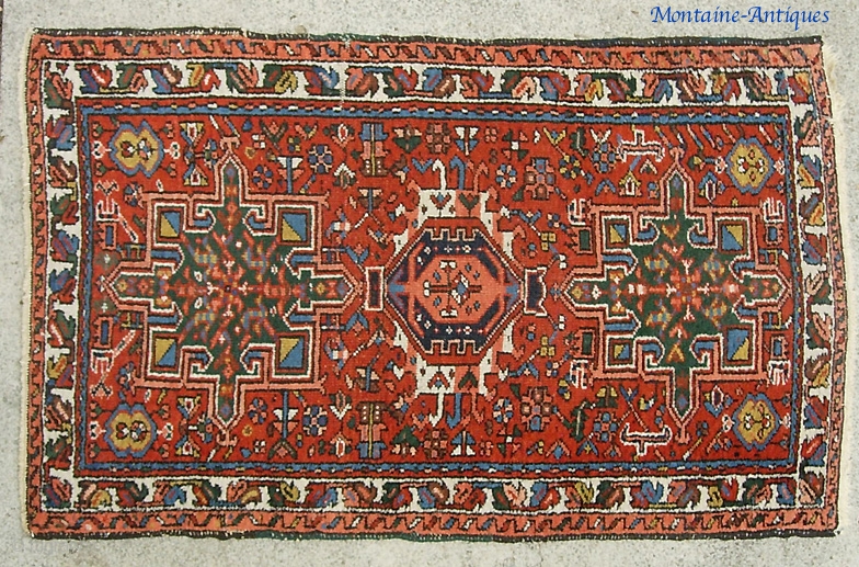 Old Karaja. Hard to find mat size: 2 ft 4 x 3 ft 11 inches. Pile is low but even with just a smattering of foundation showing in one small area.