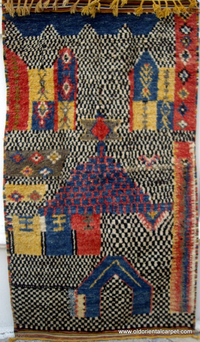 moroccan high atlas berber rug. An extraordinary piece, both in design and construction. There are several buildings, probably Mosques and Minarets portrayed in the field. Most unusually, the wool used for the knotted pile has also been used for the weft threads which can be seen on the reverse. It is from the High Atlas south of Marrakech. Reference 2305. Size 200 x 110cms. 6ft.7in. x 3ft.8in. Euros 1,650.
