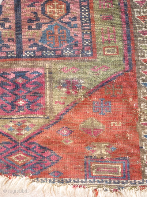 East Anatolian Yastik with spectacularly abstracted drawing. Woven with the thick glossy soft wool that this group is known for. Very colorful with abrash in the green (probably sulphonic?) and cochineal. Nice use of light blue in the bottom portion of the borders. (3 blues used.) Certainly 19th century but difficult to date. a little bigger than most Kurdish yastiks. Size is 35"x26"
