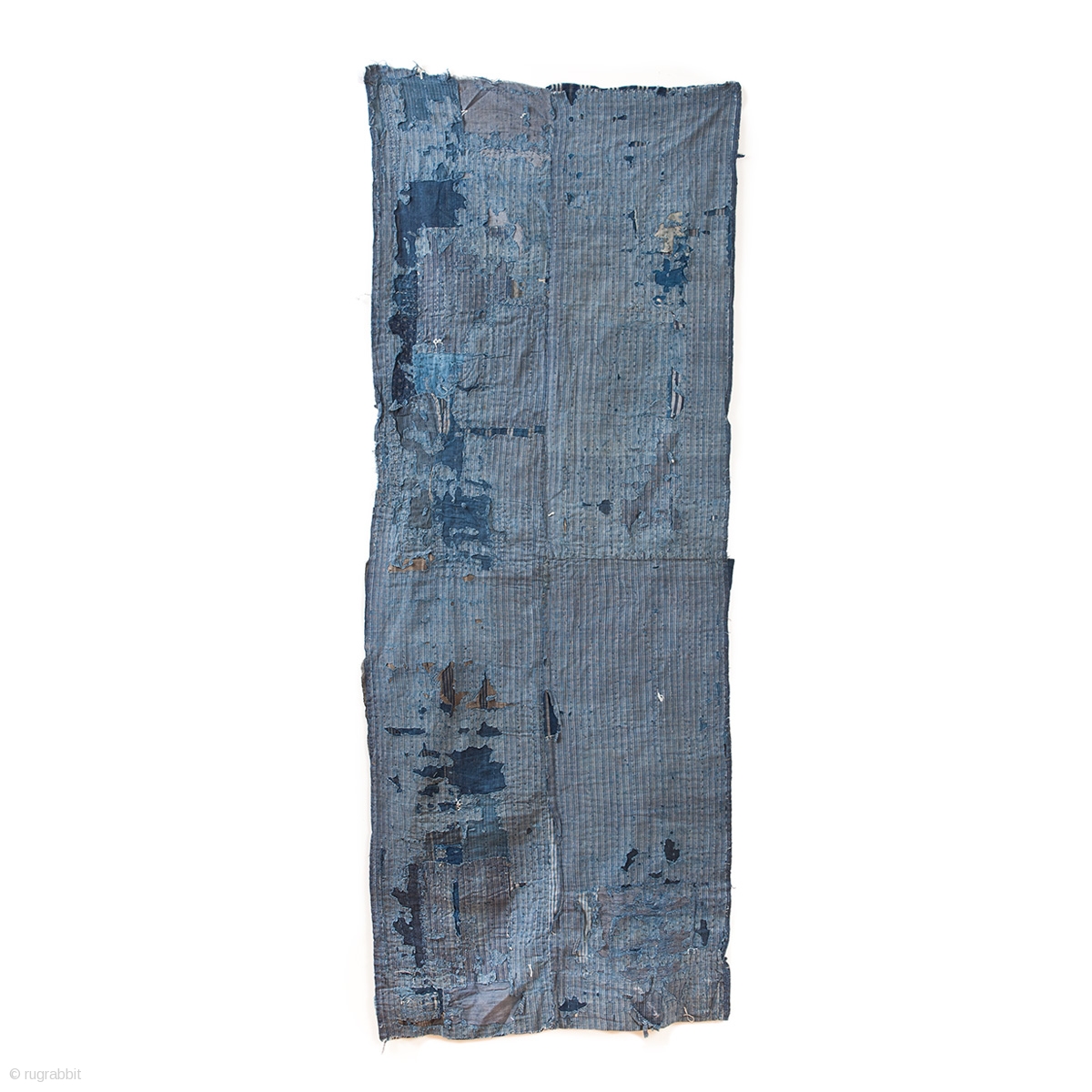 This is a large, heavily patched fragment of a Japanese boro futon cover. There are over sixty pieces of cloth on this textile, which have been sashiko stitched on top of one another to reinforce the futon and repair holes as it was used.